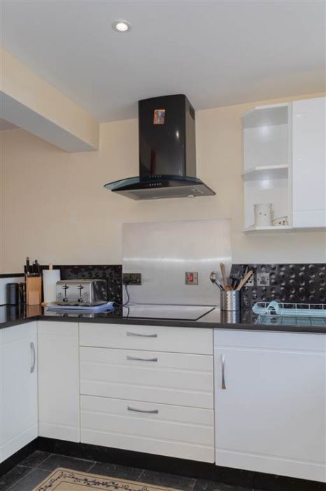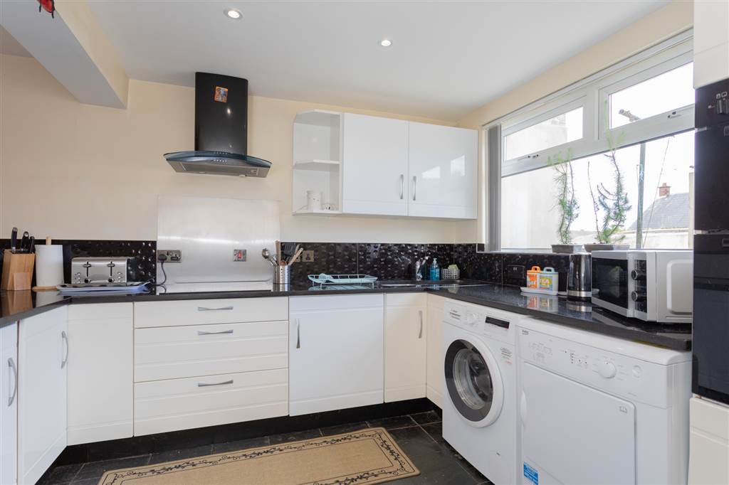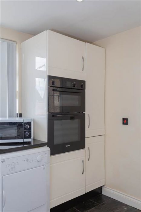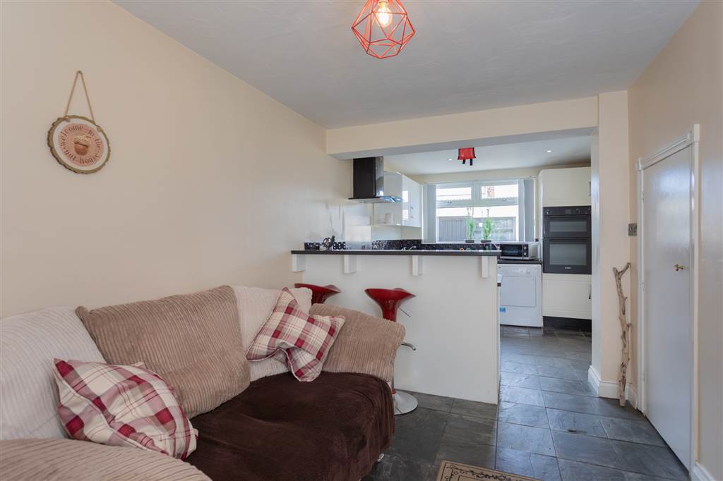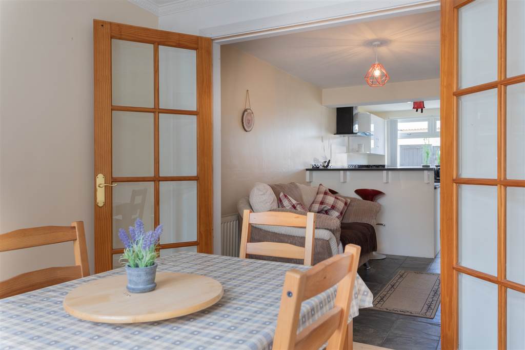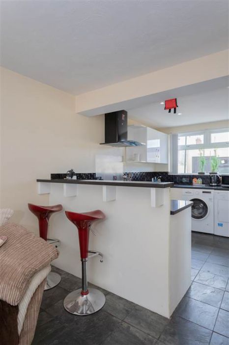 with a range of eye and low level White units. Stainless steel sink unit and drainer. Plumbed for washing machine. Integrated electric double oven and hob with stainless steel splashback and hob over. Space for tumble drier. Tiled floor. Breakfast bar area. Living area. Glazed double doors to dining room.