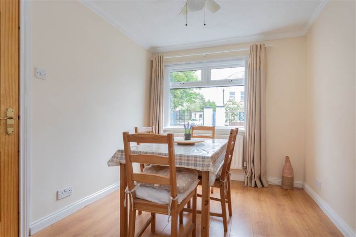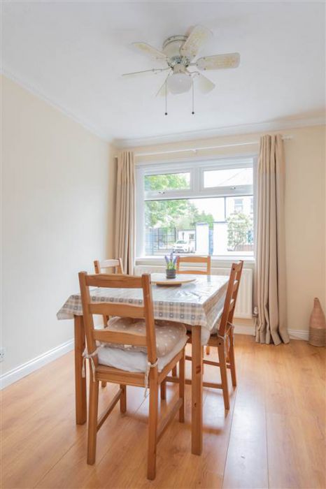 with laminated wooden flooring. Cornicing to ceiling. Glazed double doors to kitchen.