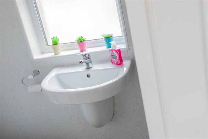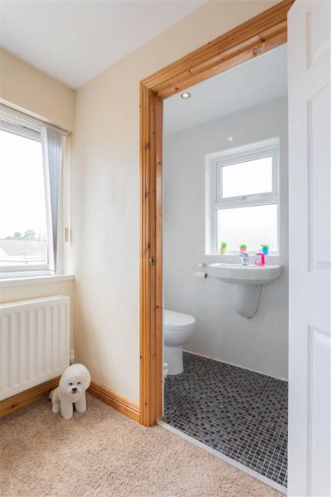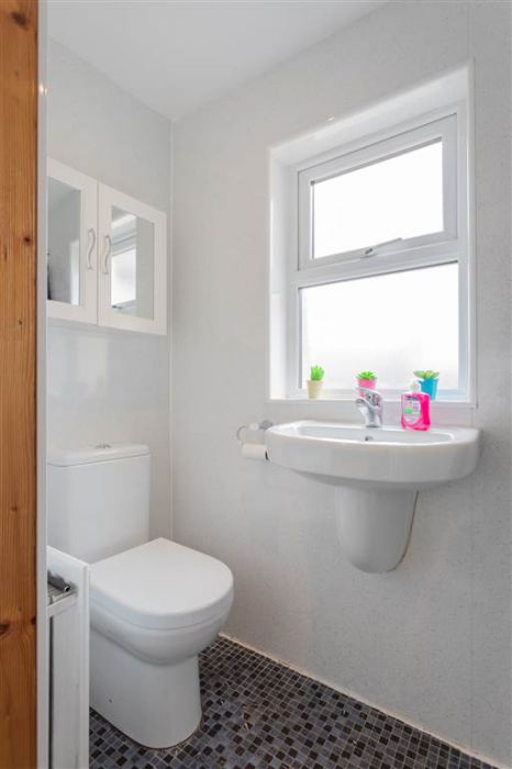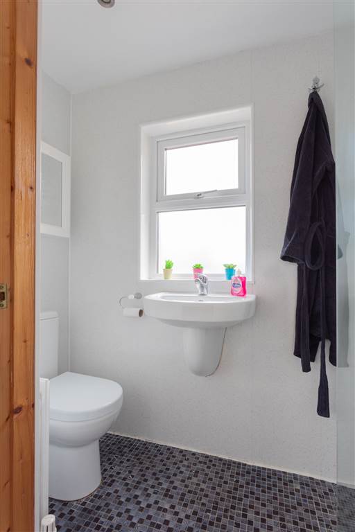 with 3 piece White suite comprising of LFWC, WHB and shower to fully panelled cubicle. Fully panelled walls and tiled floor.