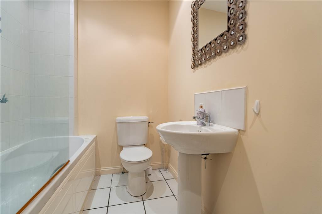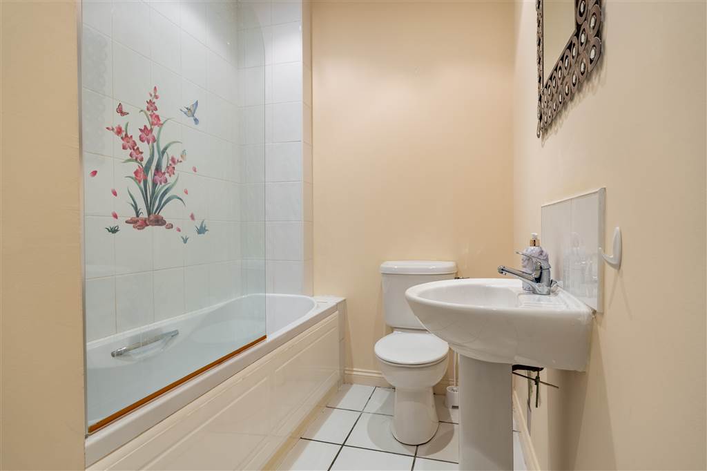 With 3-piece white suite comprising LFWC, WHB and panelled bath with shower over. Splash back tiling. Tiled flooring.