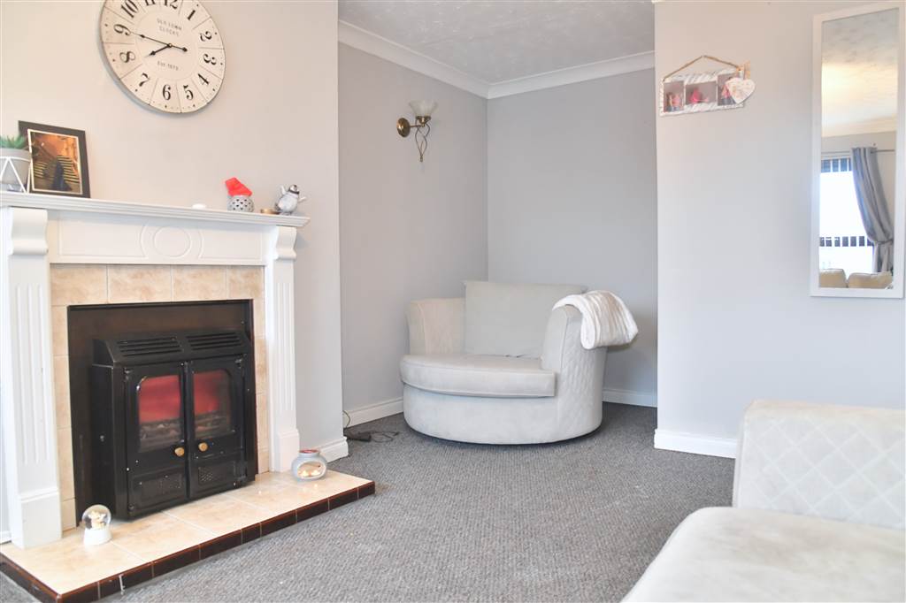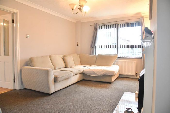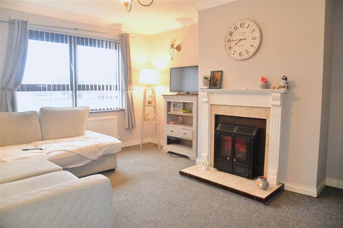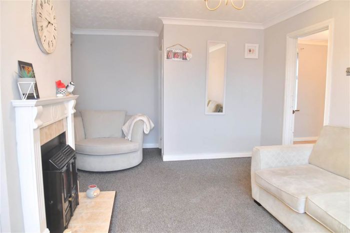 With fireplace to tiled hearth, wooden surround and mantle. Storage cupboard. Coving to ceiling. Wall lights.