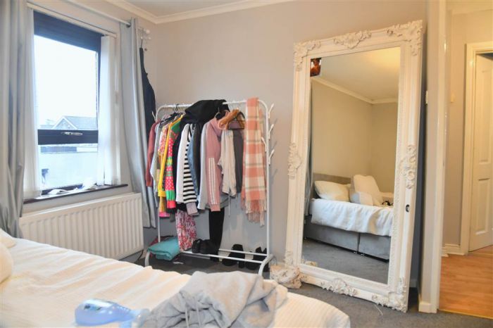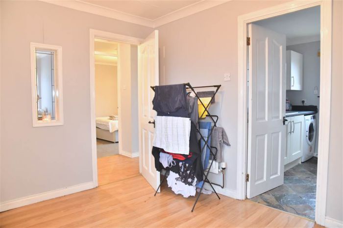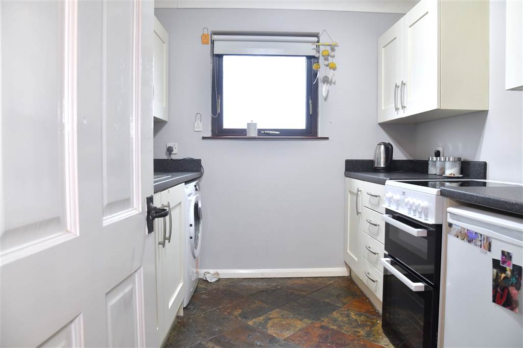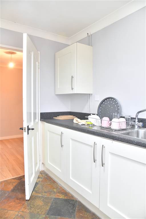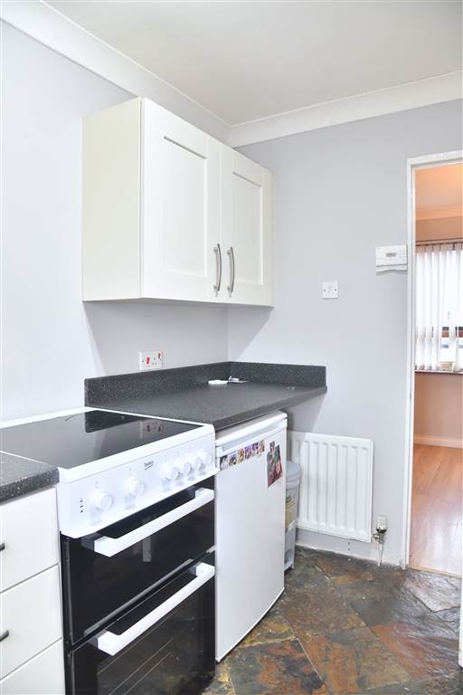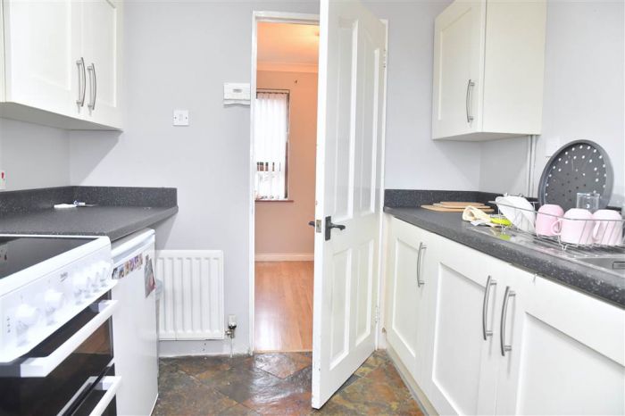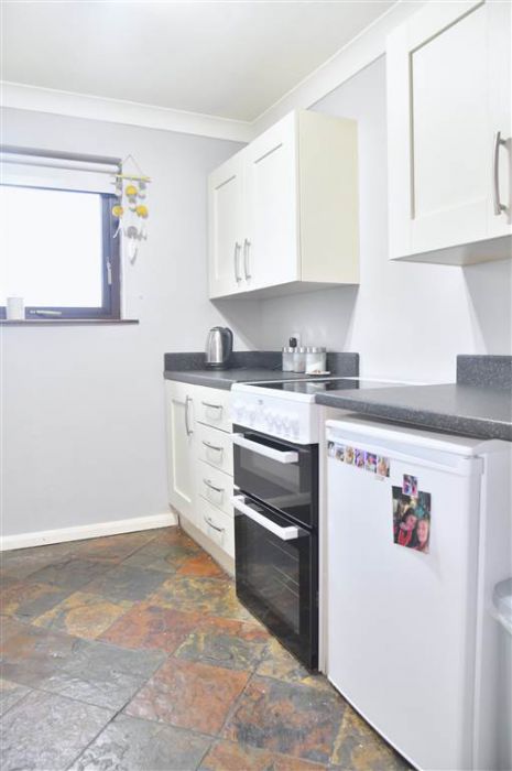With a range of eye and low level fitted units, stainless-steel sink unit and drainer with stainless-steel mixer tap. Space for four ring electric hob and oven. Space for under counter fridge-freezer. Cutlery drawers. Coving to ceiling. Tiled flooring.
