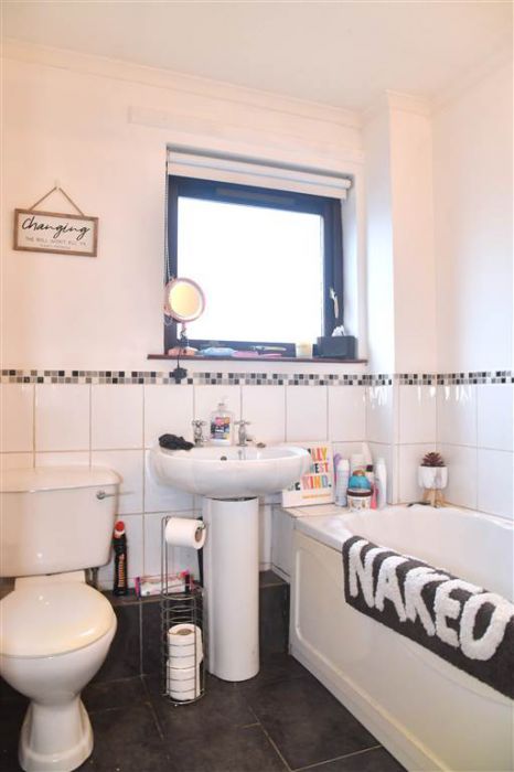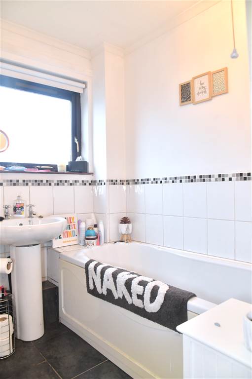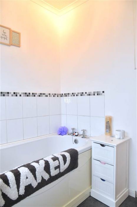 3-piece white suite comprising LFWC, WHB and panelled bath. Coving to ceiling. Part tiled walls. Tiled flooring.