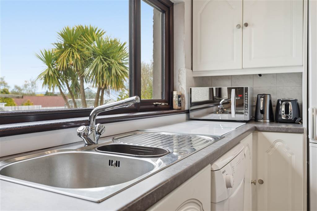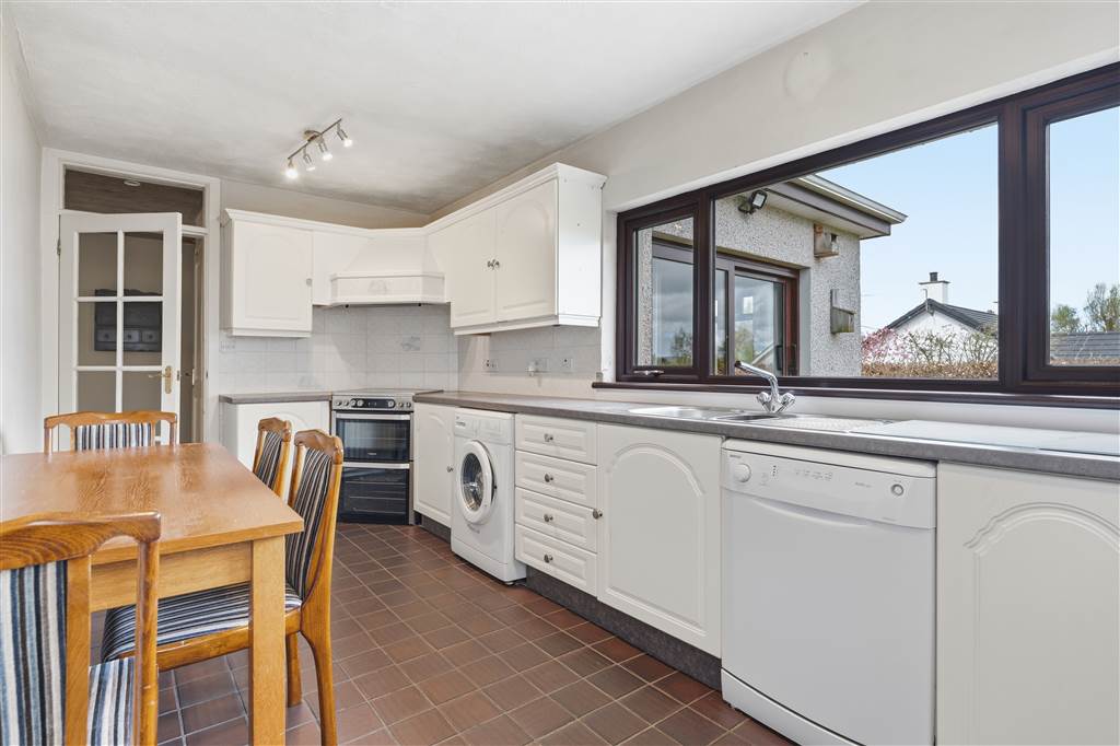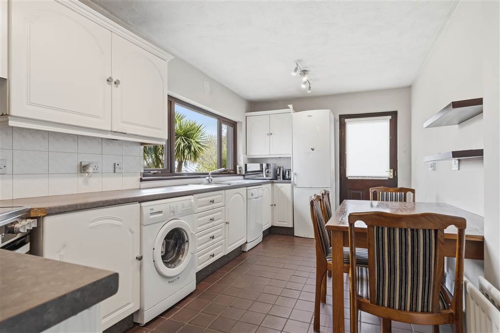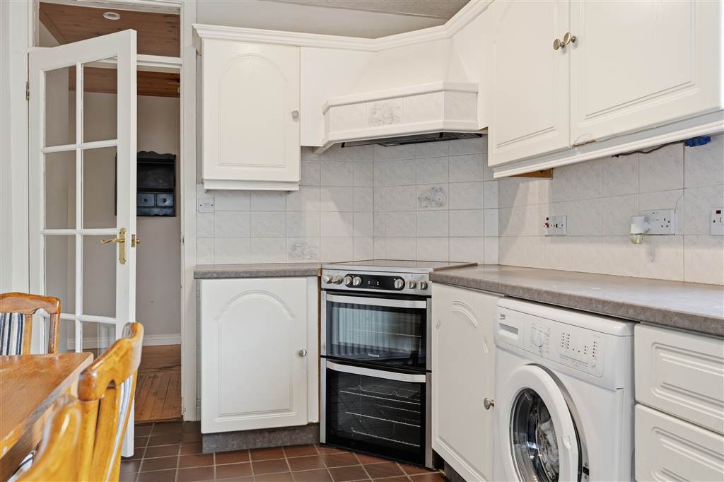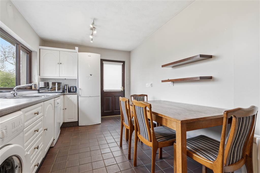 With a range of eye and low level fitted units, 1 1/4 bowl stainless-steel sink unit and drainer with stainless-steel mixer tap. Space for four ring electric hob and oven with extractor fan over. Plumbed for washing machine. Space for fridge/freezer. Plumbed for dishwasher. Space for dining. Splash back tiling. Tiled flooring. Hard wood door leading to rear.
