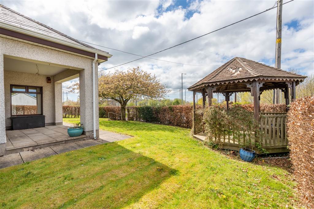 With on street parking to the front of property. Cast iron gate with paved path leading to front door. Beautifully maintained gardens in lawn to front, side and rear of property with planted shrubs and hedging. Property bounded by wooden fencing and mature hedging. Elevated patio area to front with roof over. Wooden gazebo with wooden flooring at front of property. Paved patio area to rear. Outside lights. Outside tap. Out house for storage.
