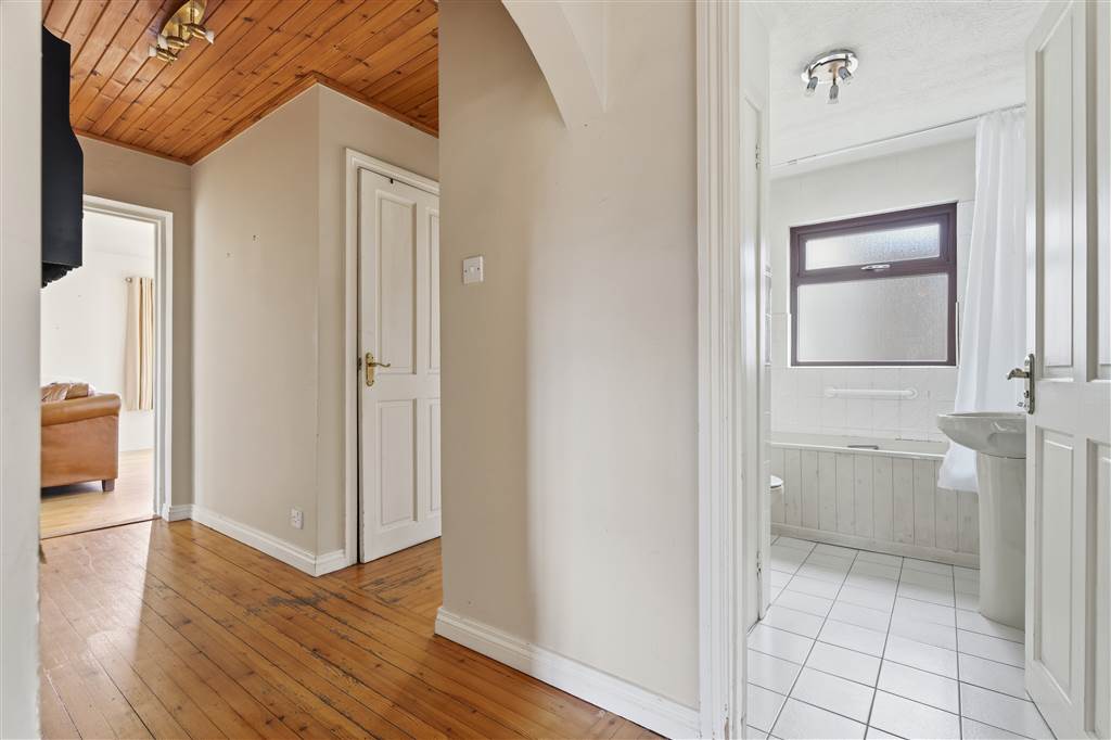 With 3-piece suite comprising LFWC, WHB and panelled bath with shower overhead. Hot-press with shelved storage. Part tiled walls. Tiled flooring.