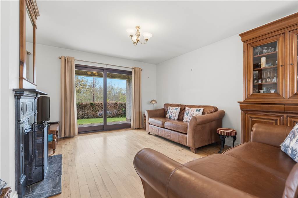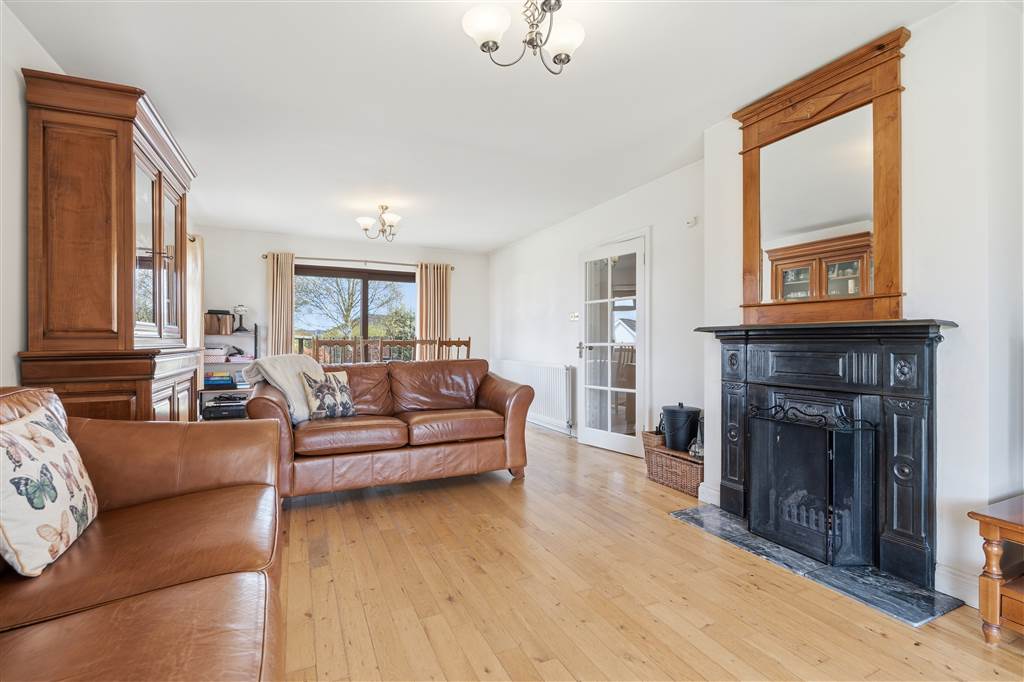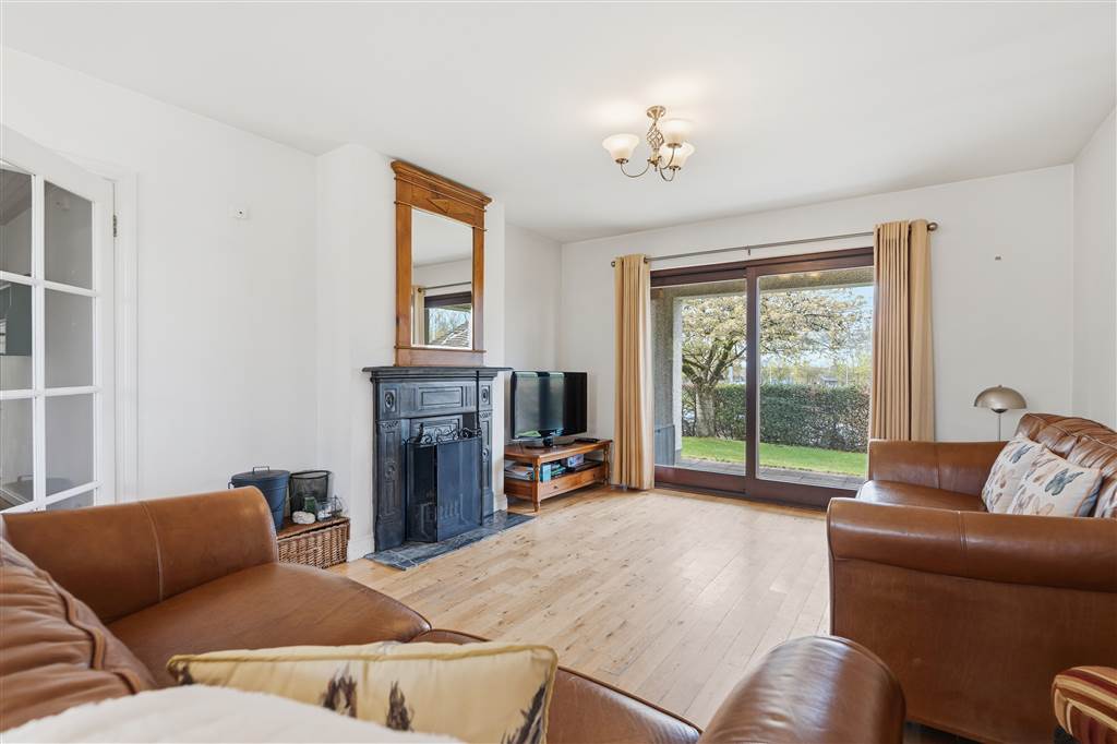 With cast iron fireplace to tiled hearth. Space for dining. Glazed hardwood sliding doors to front and rear. Solid wooden flooring.