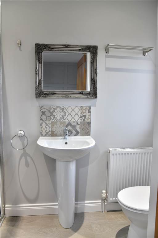 With 3 piece white suite comprising LFWC, WHB and shower to enclosed corner cubicle. Splashback tiling. Porcelanosa wood effect tiled flooring.