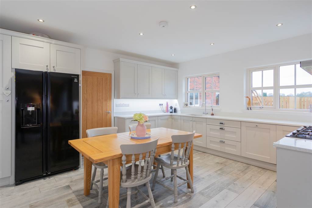 With a range of eye and low level fitted units with chrome handles and granite worktops, stainless steel sink unit with granite drainer and stainless steel mixer tap. Space for Rangemaster style stove with stainless steel extractor fan over. Space for American style fridge/freezer. Integrated dishwasher. Under pelmet lighting. Spacious dining area. Spotlighting to ceiling. Porcelanosa wood effect tiled flooring. Open plan to lounge.