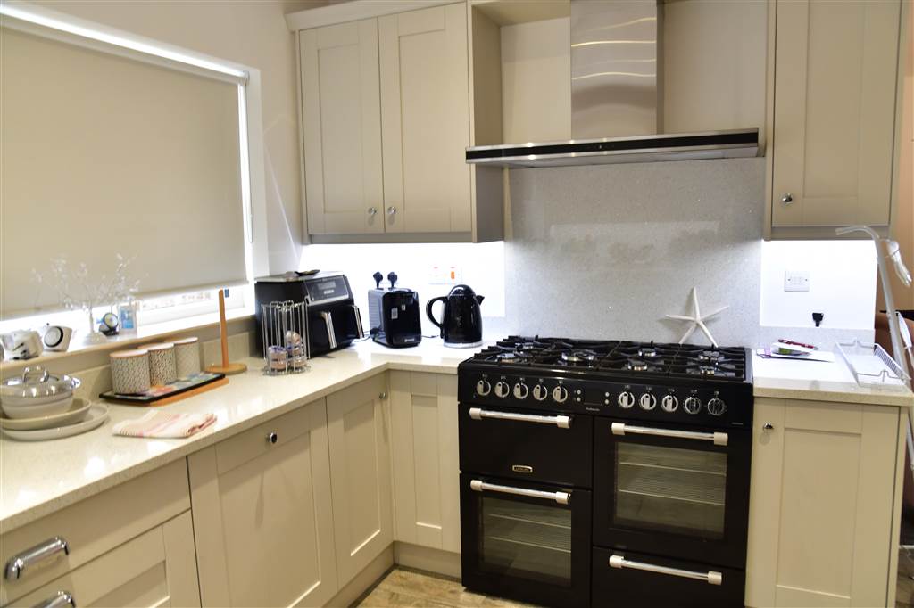 With a range of eye and low level fitted units with chrome handles, stainless steel sink unit and drainer with stainless steel mixer tap. Plumbed for washing machine. Space for fridge/freezer. Space for microwave. Porcelanosa wood effect tiled flooring. PVC door to rear.