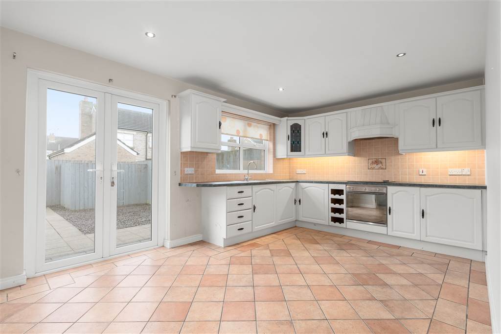 With a range of eye and low-level fitted units, 1 1/4 bowl stainless-steel sink unit and drainer with stainless-steel mixer tap. Integrated four ring electric hob and oven with extractor fan over. Space for fridge-freezer. Glazed display cupboard. Cutlery drawers. Wine rack. Spacious area for dining. Under cabinet lighting. Spot lighting to ceiling. Splash back tiling. Tiled flooring. PVC double doors to rear.