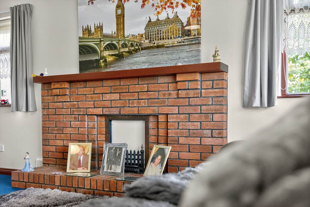 Living room with exposed red brick fireplace