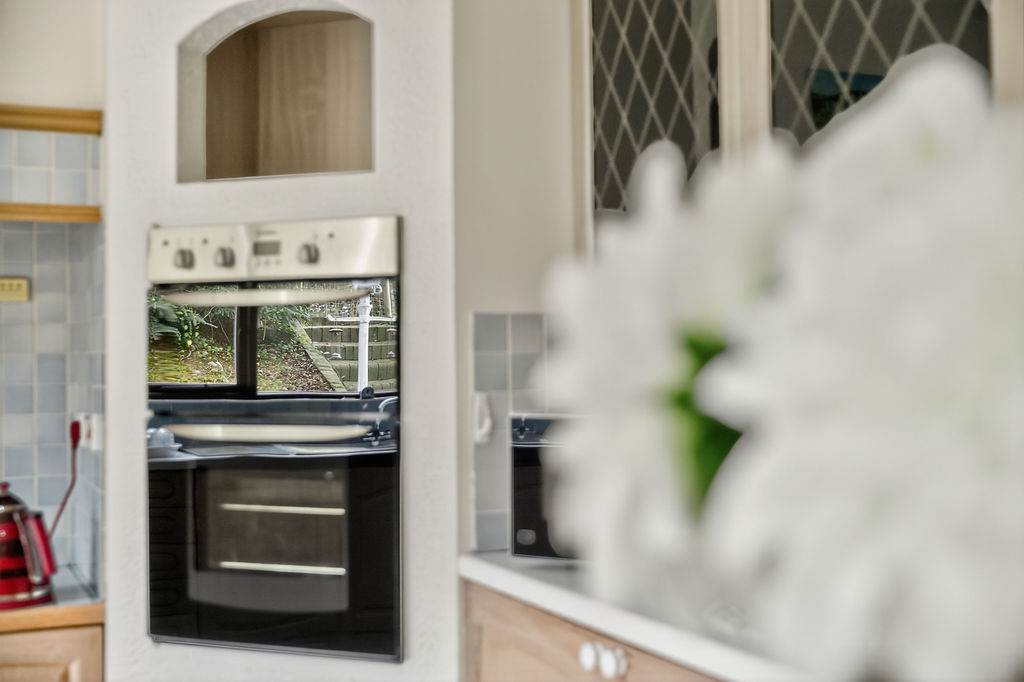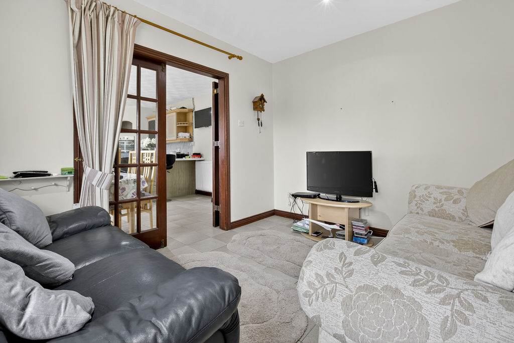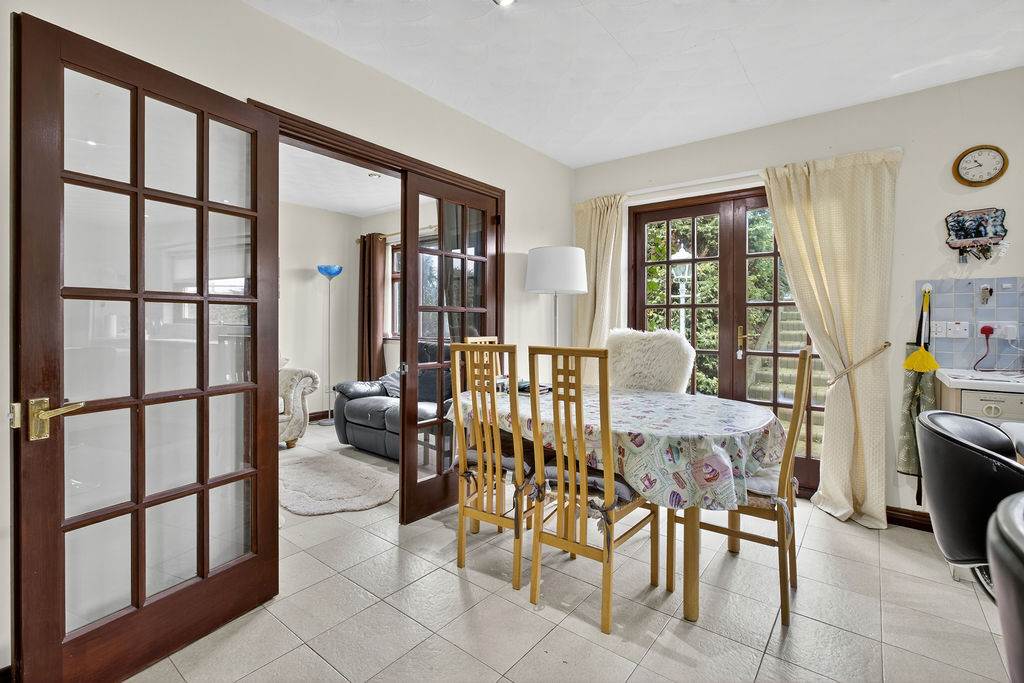 With a range of eye and low-level fitted units, 1 1/4 bowl sink unit and drainer with stainless-steel mixer tap. Integrated four ring electric hob with extractor fan over. Integrated double oven. Integrated dishwasher. Space for fridge-freezer. Cutlery drawers. Glazed display cupboards. Breakfast bar with seating area. Spacious area for dining. Hardwood glazed double doors leading to rear. Spot lighting to ceiling. Splash back tiling. Tiled flooring. Hardwood glazed double doors leading to family room.