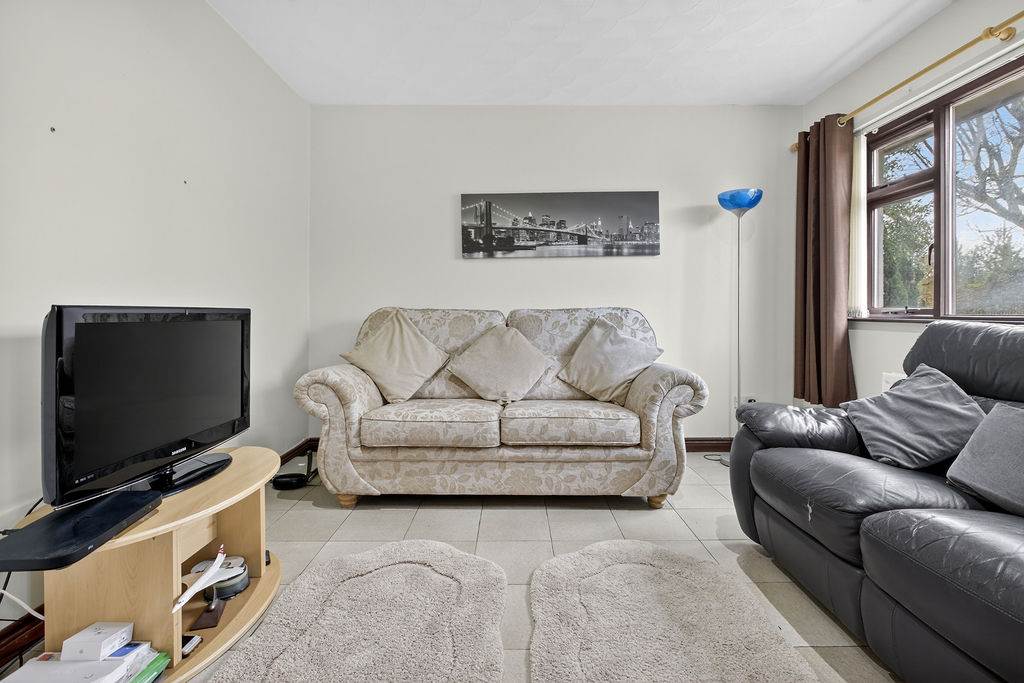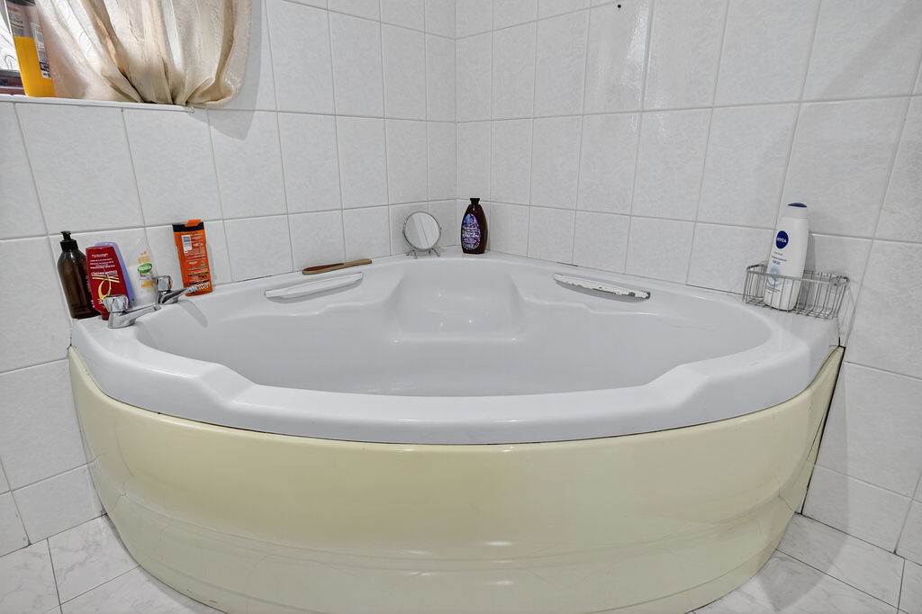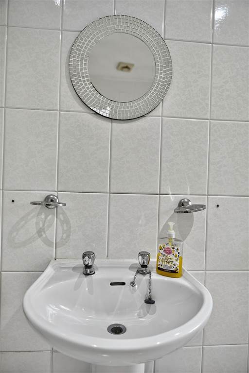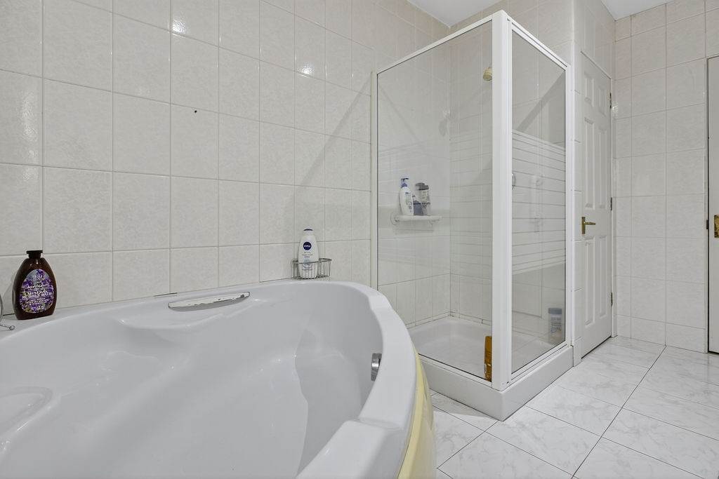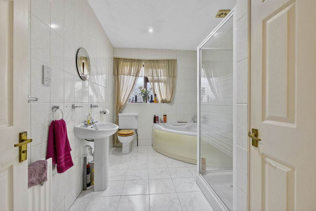 With 4-piece white suite comprising LFWC, WHB, corner bath and shower to enclosed tiled corner cubicle. Hot-press. Spot lighting to ceiling. Tiled walls. Tiled flooring.