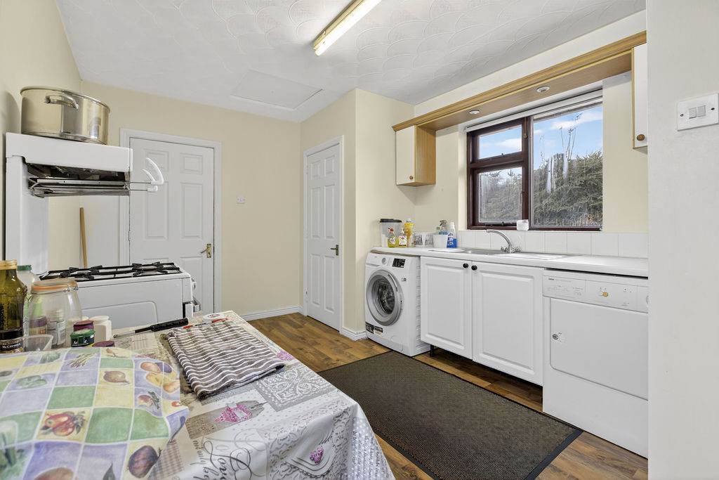 With eye and low-level fitted units, stainless-steel sink unit and drainer with stainless-steel mixer tap. Plumbed for washing machine. Space for tumble dryer. Built-in storage cupboard. Splash back tiling. Laminated wooden flooring. Door to integral double garage.