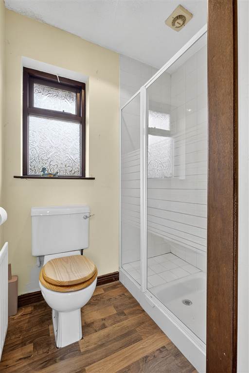 With LFWC and shower to enclosed tiled cubicle. Laminated wooden flooring.