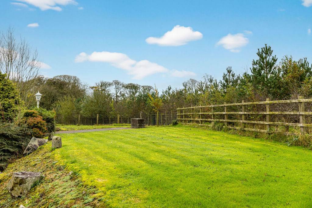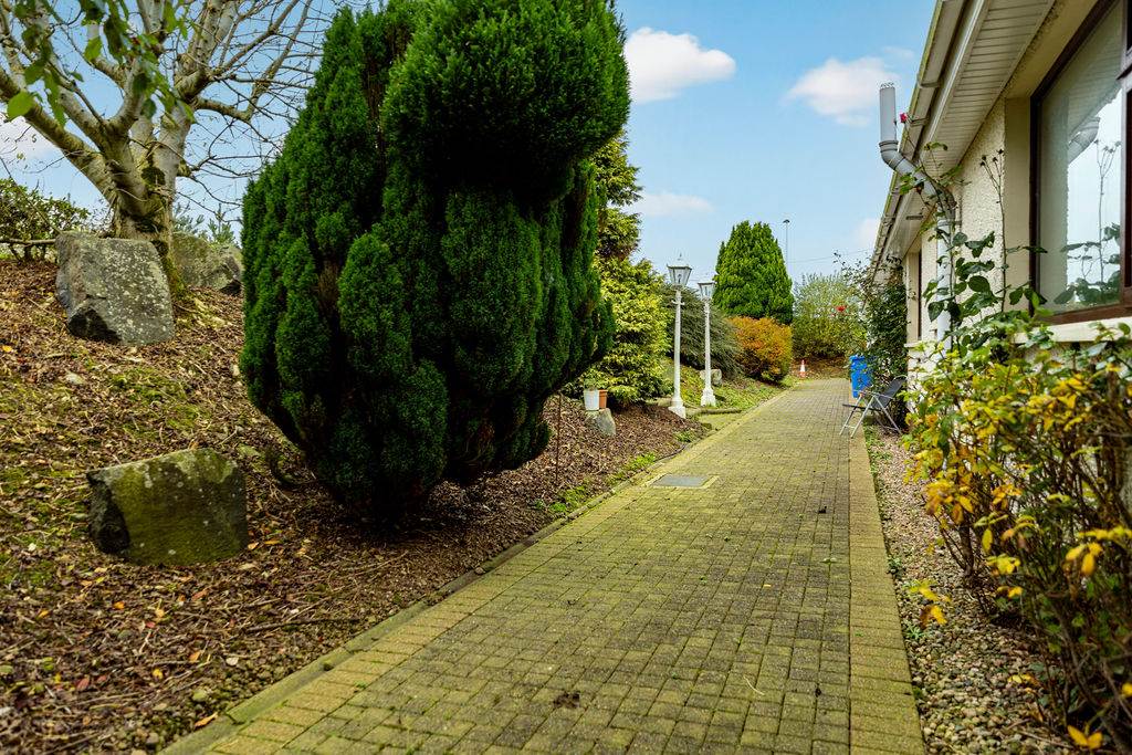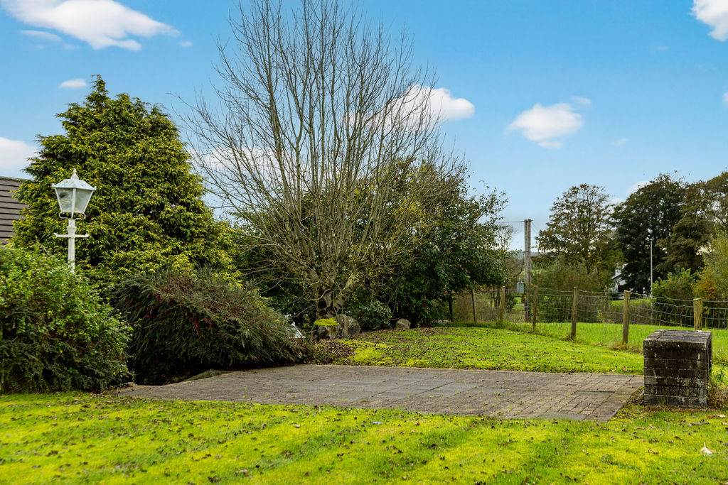 With paved driveway leading to spacious paved area for ample parking. Gardens in lawn to side and rear of property. Decorative pebbled area at front of property. Mature hedging at front of property. Paved path surrounding property with steps leading to lawn at rear. Planted shrubs to rear. Paved patio area ideal for outdoor entertaining or BBQ season. Outside lights. Outside tap. Field at front of property.