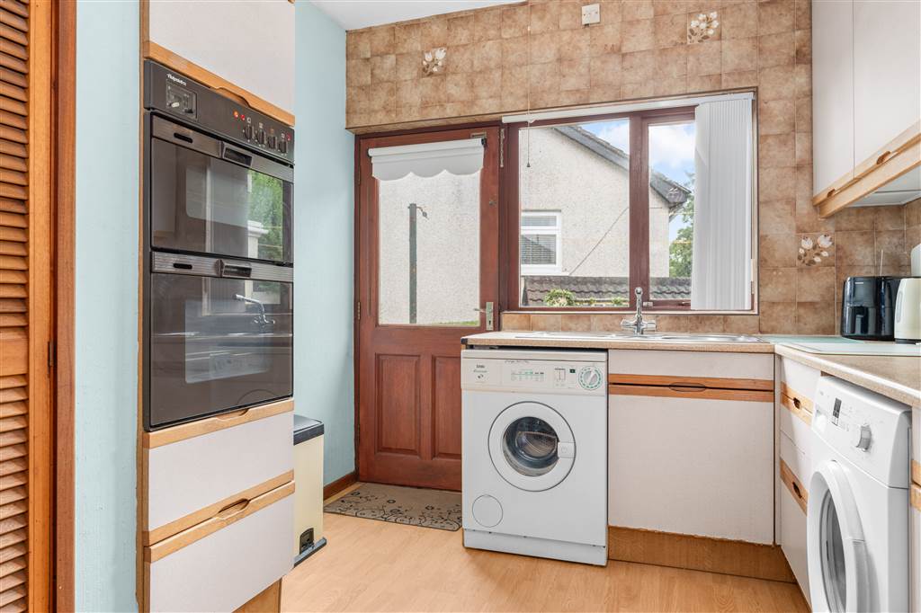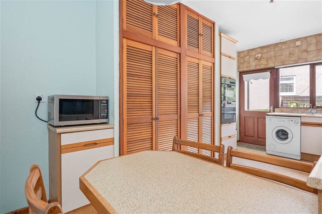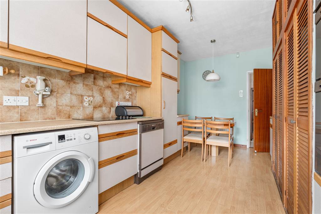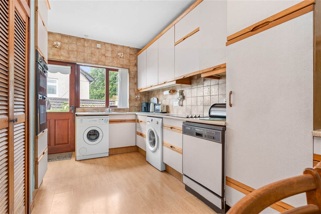 With a range of eye and low-level fitted units, 1 1/4 bowl stainless-steel sink unit and drainer with stainless-steel mixer tap. Integrated four ring electric hob with extractor fan over. Integrated oven. Plumbed for dishwasher. Plumbed for washing machine. Space for tumble dryer. Built-in storage cupboards. Hot-press with shelved storage. Cutlery drawers. Saucepan drawers. Splash back tiling. Hardwood door to rear.