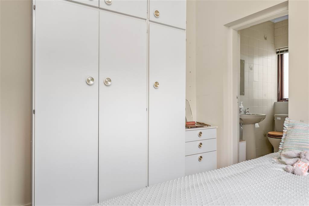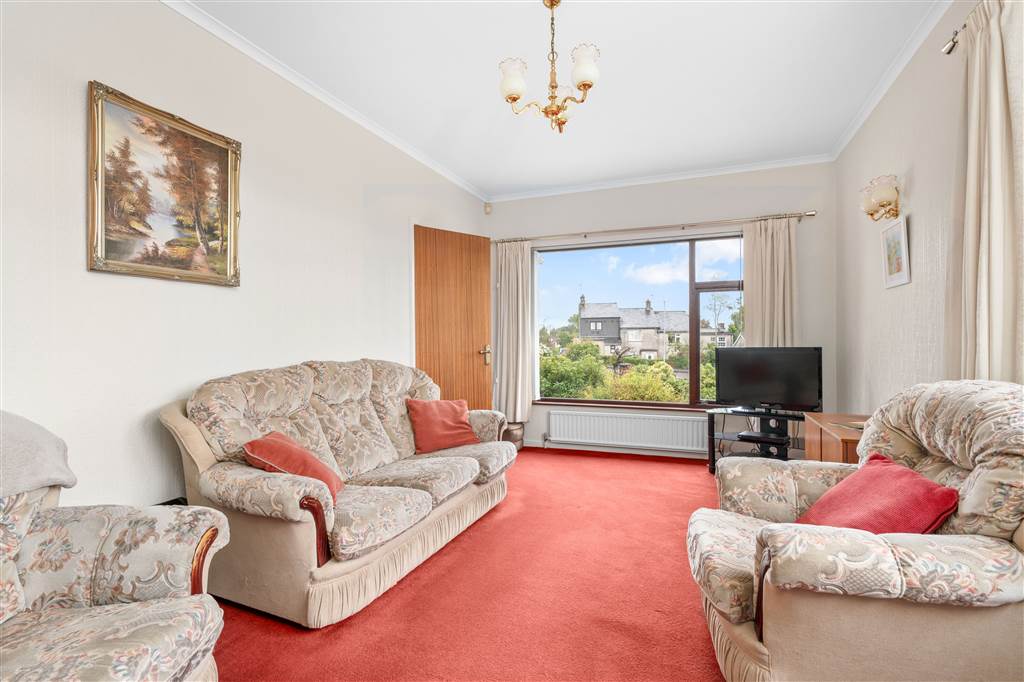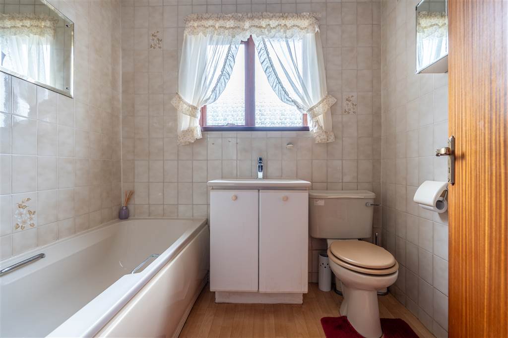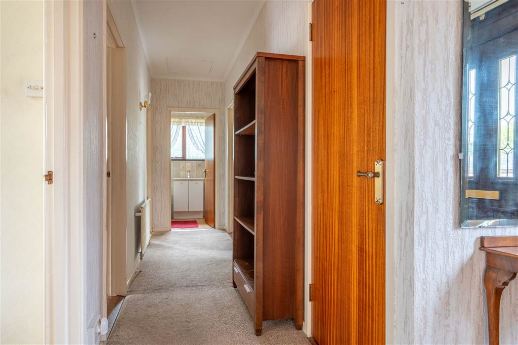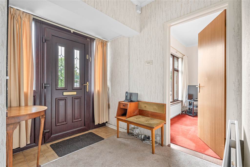 With PVC front door with decorative glazed pane and glazed side panes. Wall light. Access to floored loft. Built-in storage cupboard. Coving to ceiling. Part tiled, part carpet to floor.