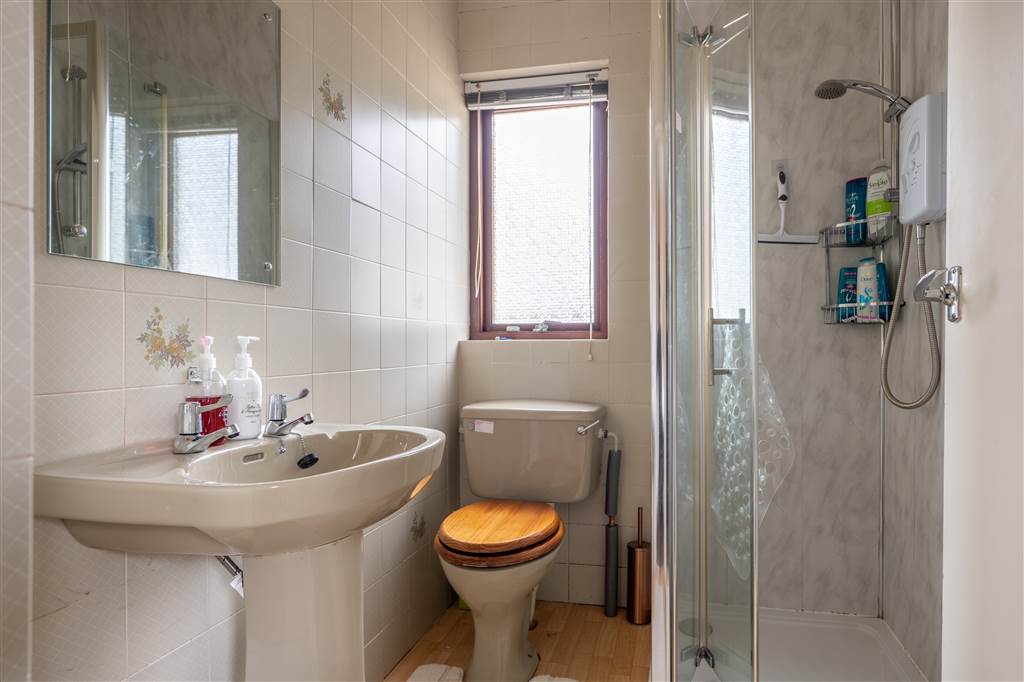 With 3-piece suite comprising LFWC, WHB and shower to enclosed corner cubicle. Tiled walls.