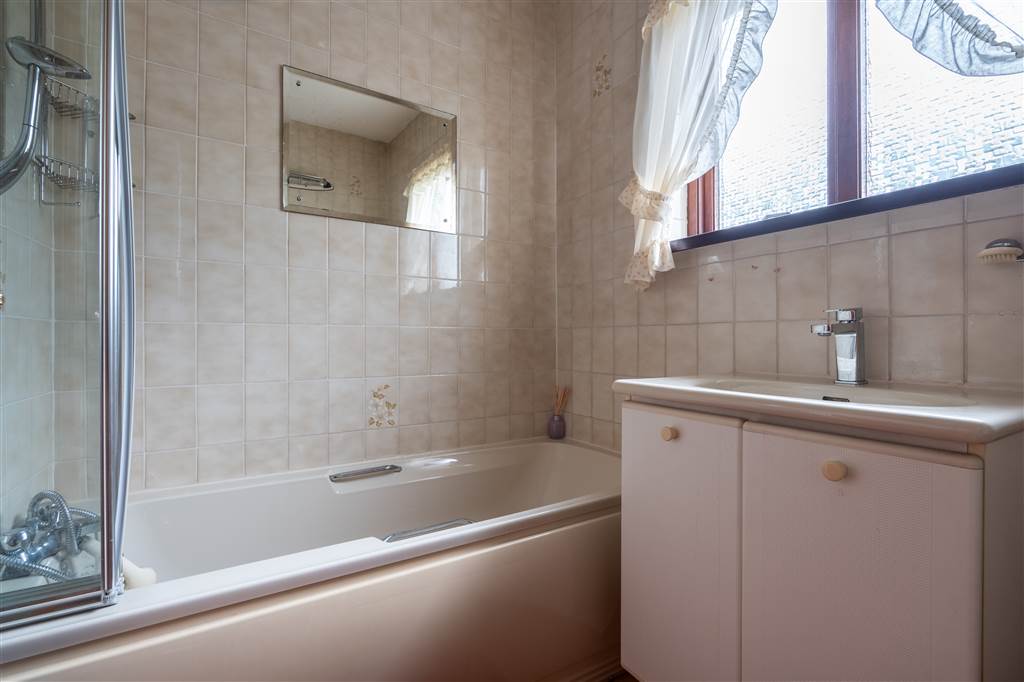 With 3-piece suite comprising LFWC, WHB with built-in vanity unit and panelled bath with shower over. Tiled walls.