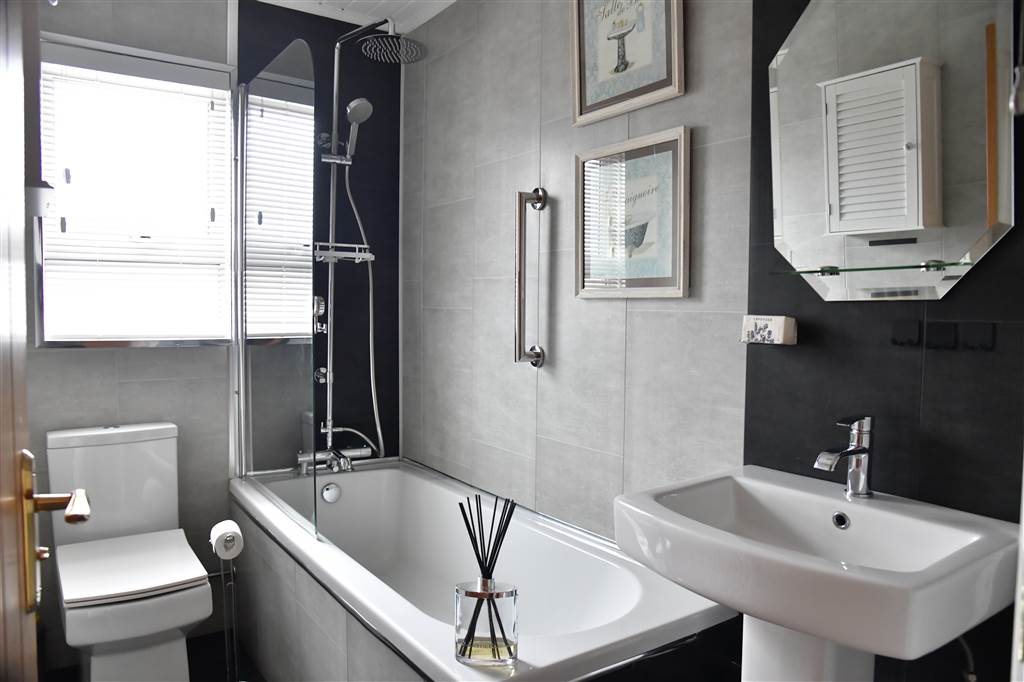 With 3-piece white suite comprising LFWC, WHB and panelled bath with shower over.