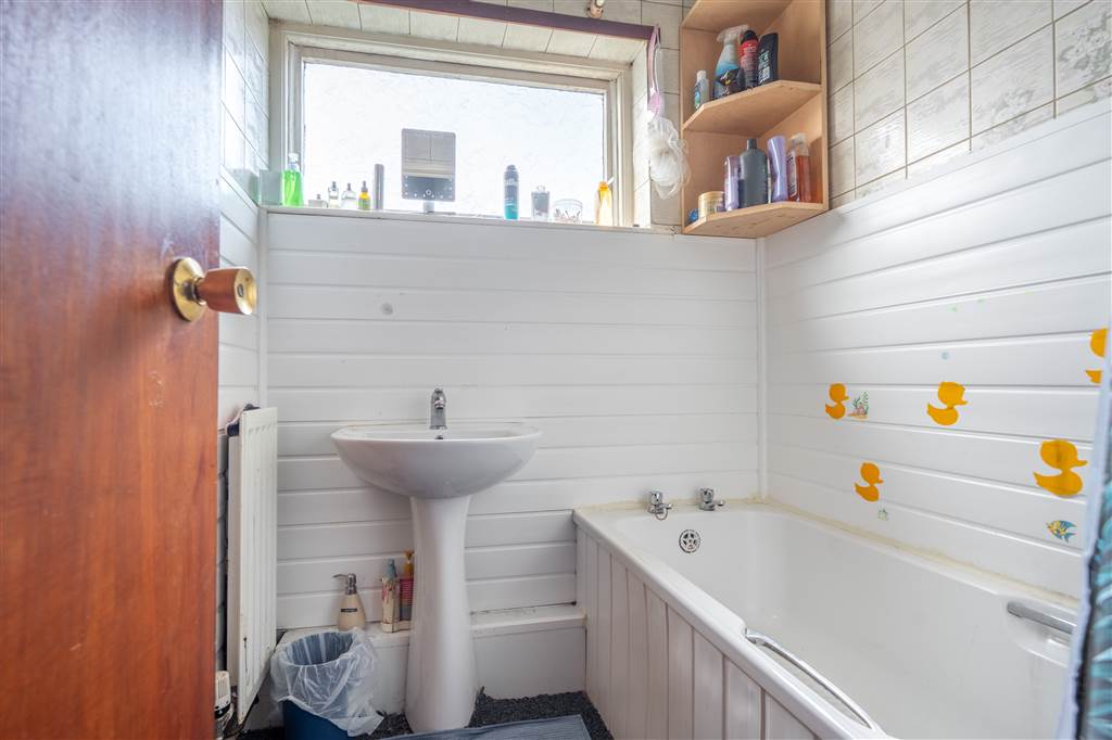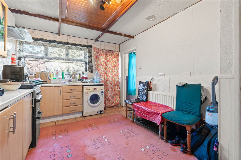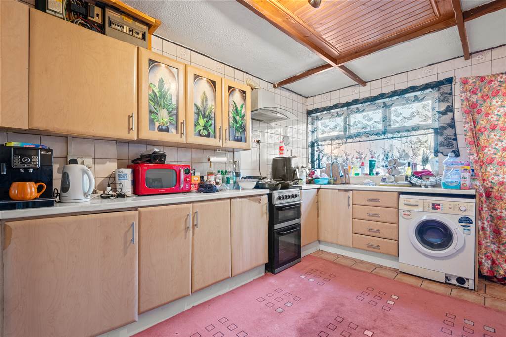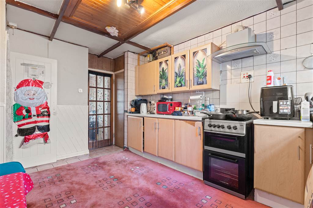 With a range of eye and low-level fitted units, stainless-steel sink unit and drainer with stainless-steel mixer tap. Space for four ring electric hob and oven with stainless-steel extractor fan over. Plumbed for washing machine. Space for fridge-freezer. Cutlery drawers. Under stair storage cupboard. Built-in storage cupboard. Part tiled walls. Tiled flooring. Hardwood door to rear.