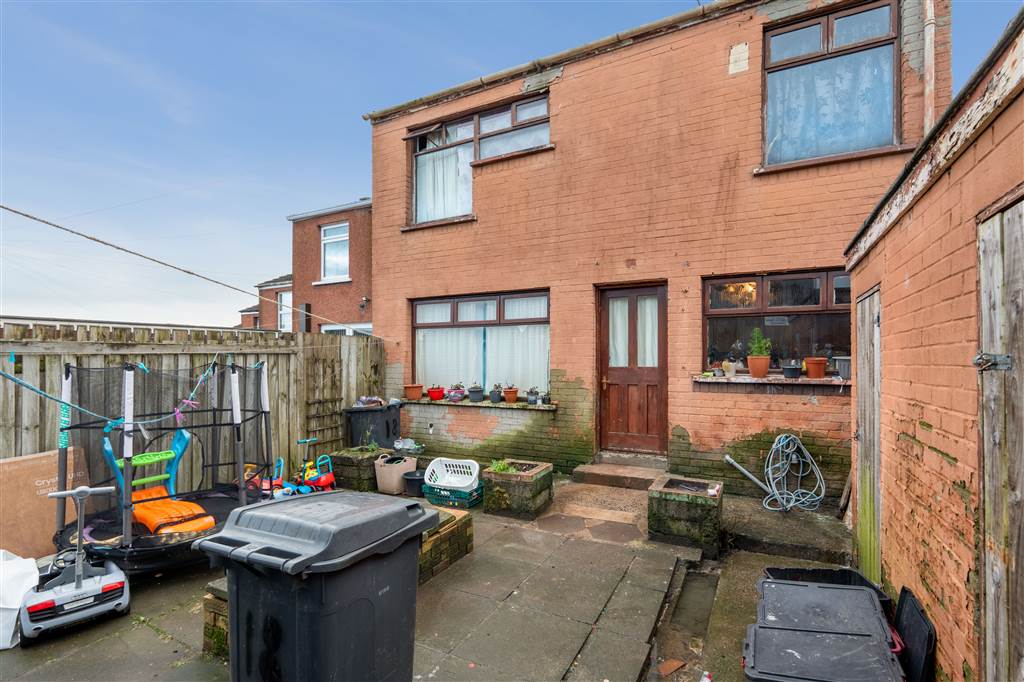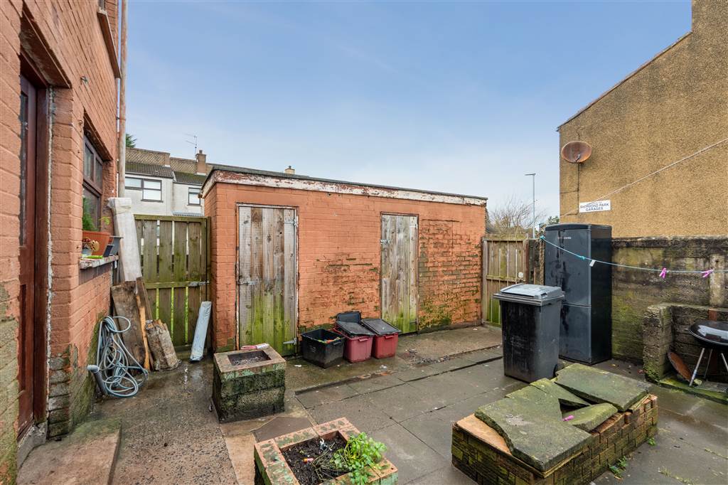 With concrete drive at front of property for off-street parking. Garden in lawn at side of property with planted shrubs. Enclosed paved yard to rear bounded by wall, wooden fencing and wooden gate. Outside tap.