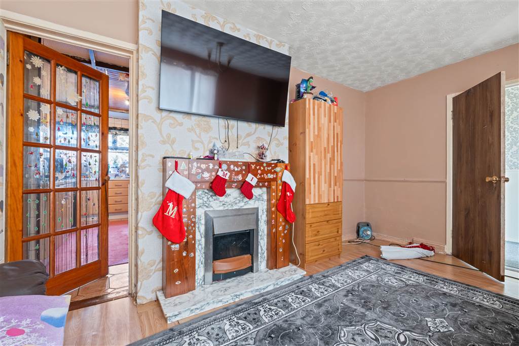 With fireplace to wooden surround and mantle. Dado rail. Laminated wooden flooring. Glazed door to kitchen.