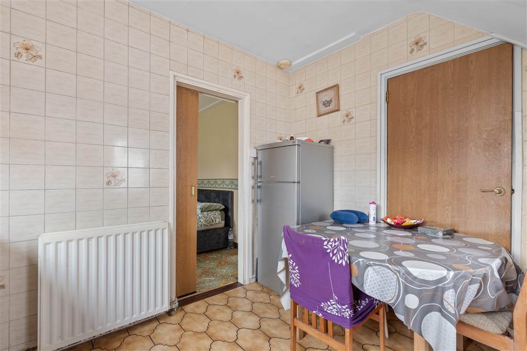 With a range of eye and low-level fitted units, stainless-steel sink unit and drainer with stainless-steel mixer tap. Space for four ring electric hob and oven with extractor fan over. Space for fridge-freezer. Cutlery drawers. Built-in storage cupboard. Tiled walls. Tiled flooring. PVC door to rear.