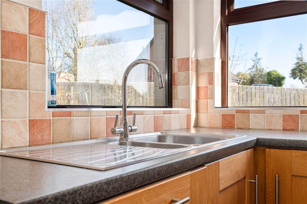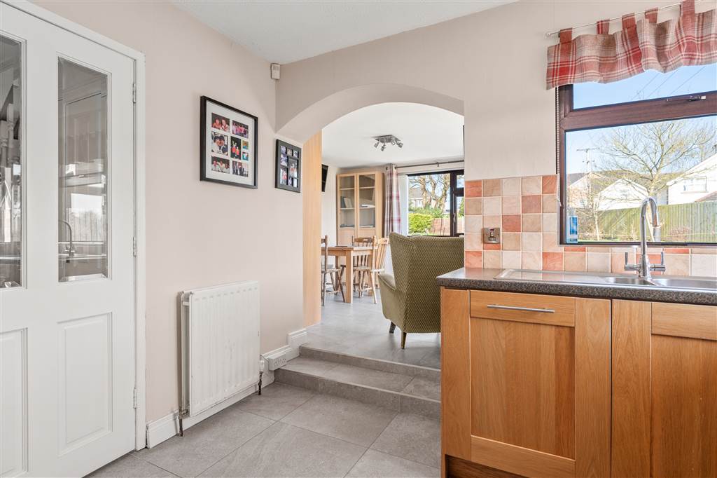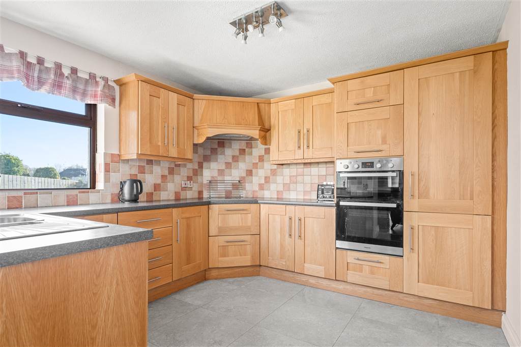 With a range of eye and low-level solid Oak fitted units, 1 1/4 bowl stainless-steel sink unit and drainer with stainless-steel mixer tap. Integrated four ring electric hob with extractor fan over. Integrated oven. Integrated dishwasher. Integrated fridge-freezer. Cutlery drawers. Saucepan drawers. Splash back tiling. Tiled flooring. Steps leading to sun room.