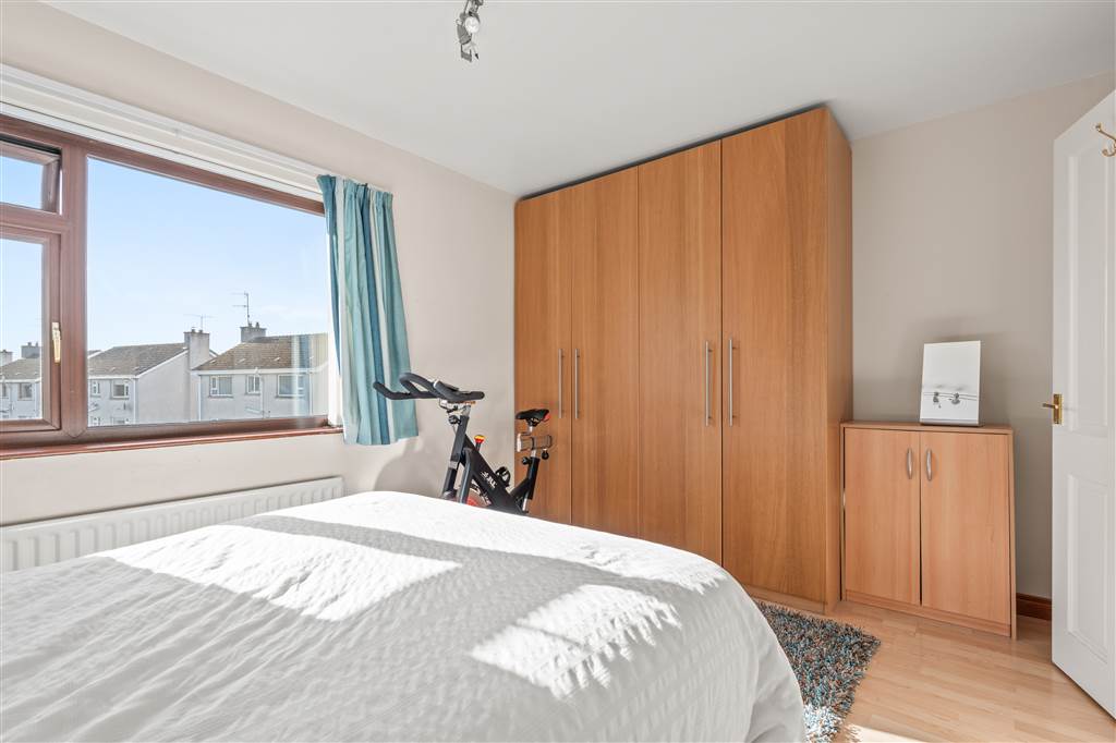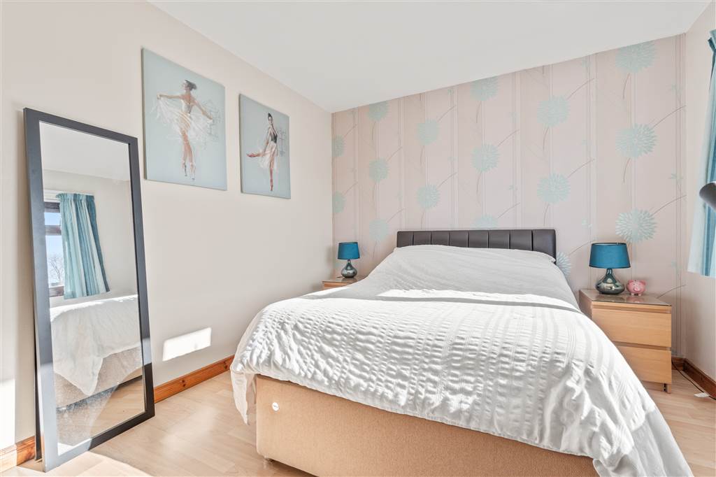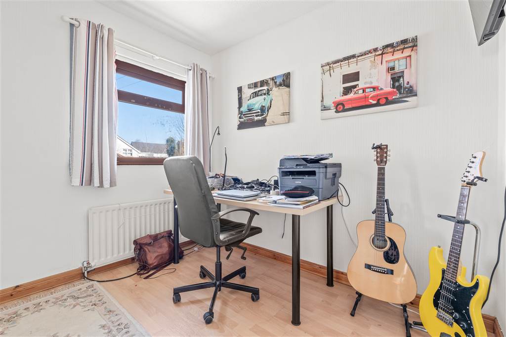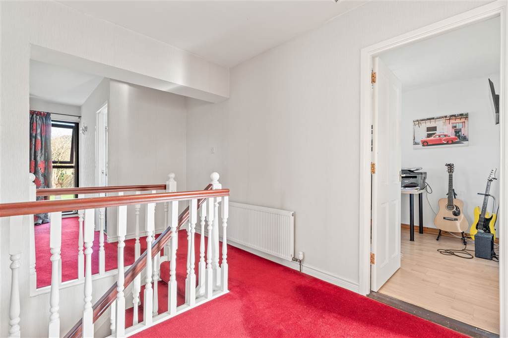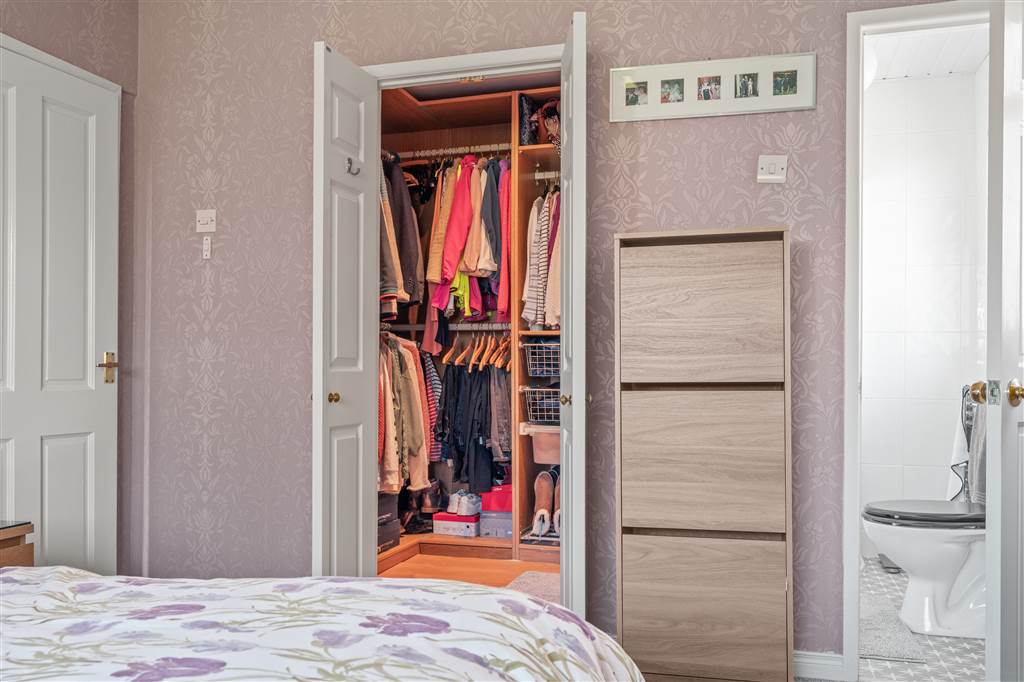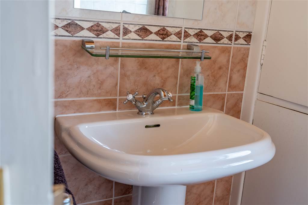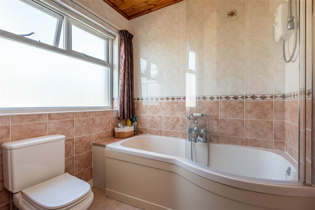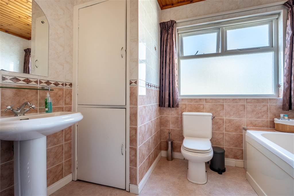 With 3-piece white suite comprising LFWC, WHB and P-shaped bath with electric shower over. Heated towel rail. Hot-press with shelved storage. Built-in storage cupboard. Tiled walls.
