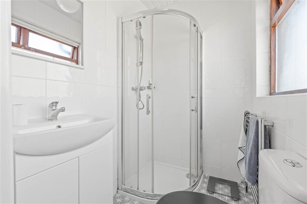 With 3-piece white suite comprising LFWC, WHB with built-in vanity unit and shower to enclosed tiled corner cubicle. Heated towel rail. Tiled walls.