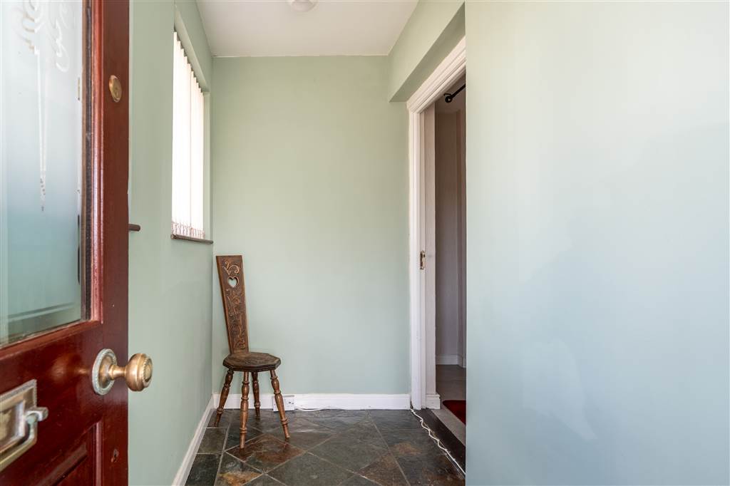 With hardwood front door with decorative glazed panes and glazed side panes. Tiled flooring. Door to entrance hall.