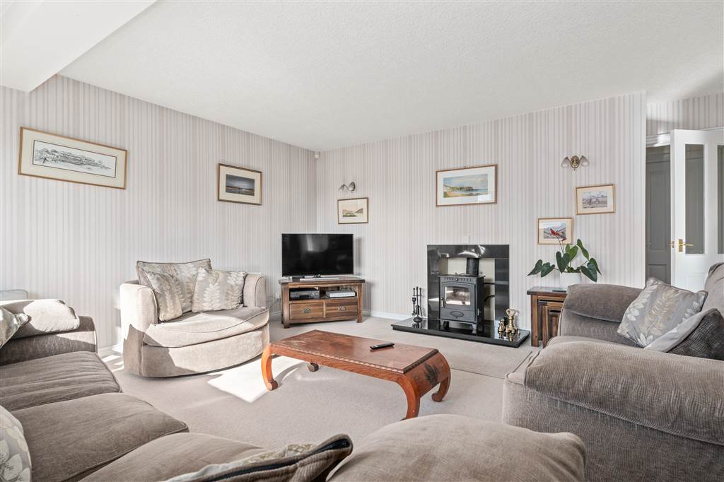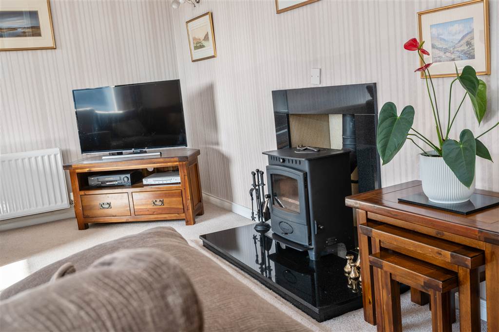 With Aarrow multi-fuel burning stove to granite hearth. Wall lights. Double doors to dining room.