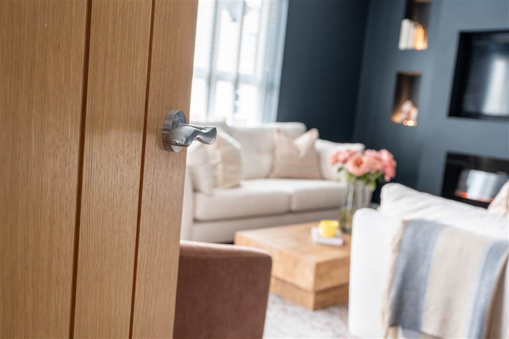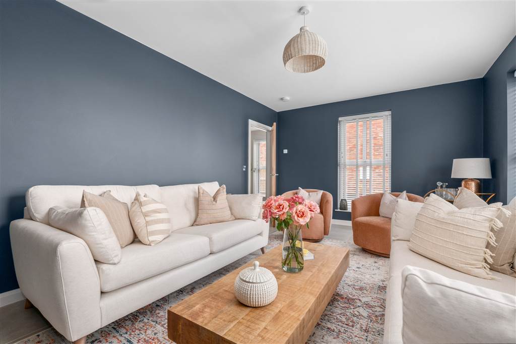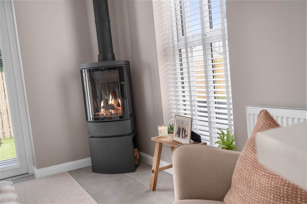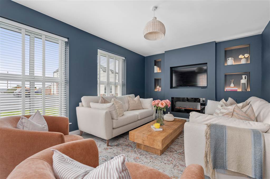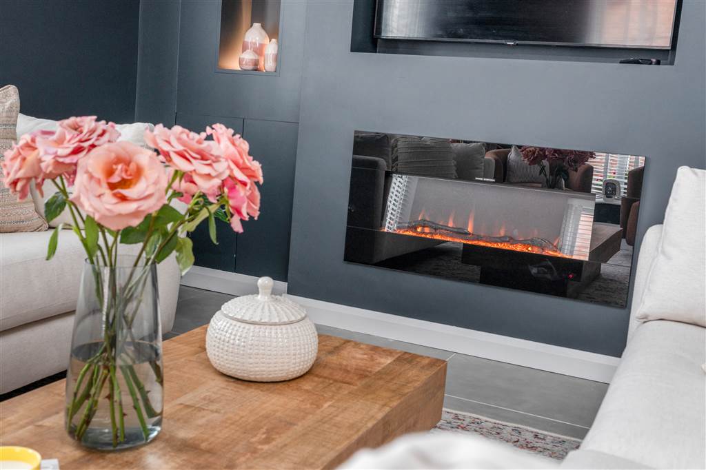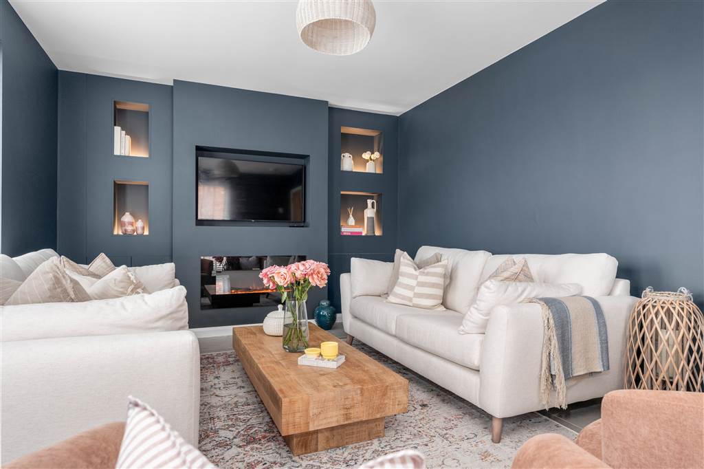Living room with wall mounted fire and media wall