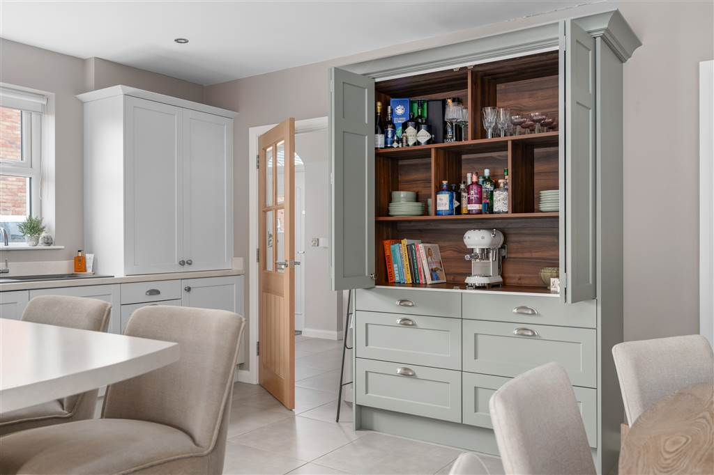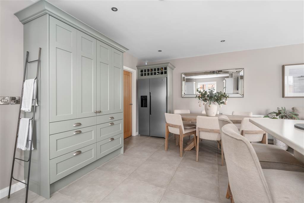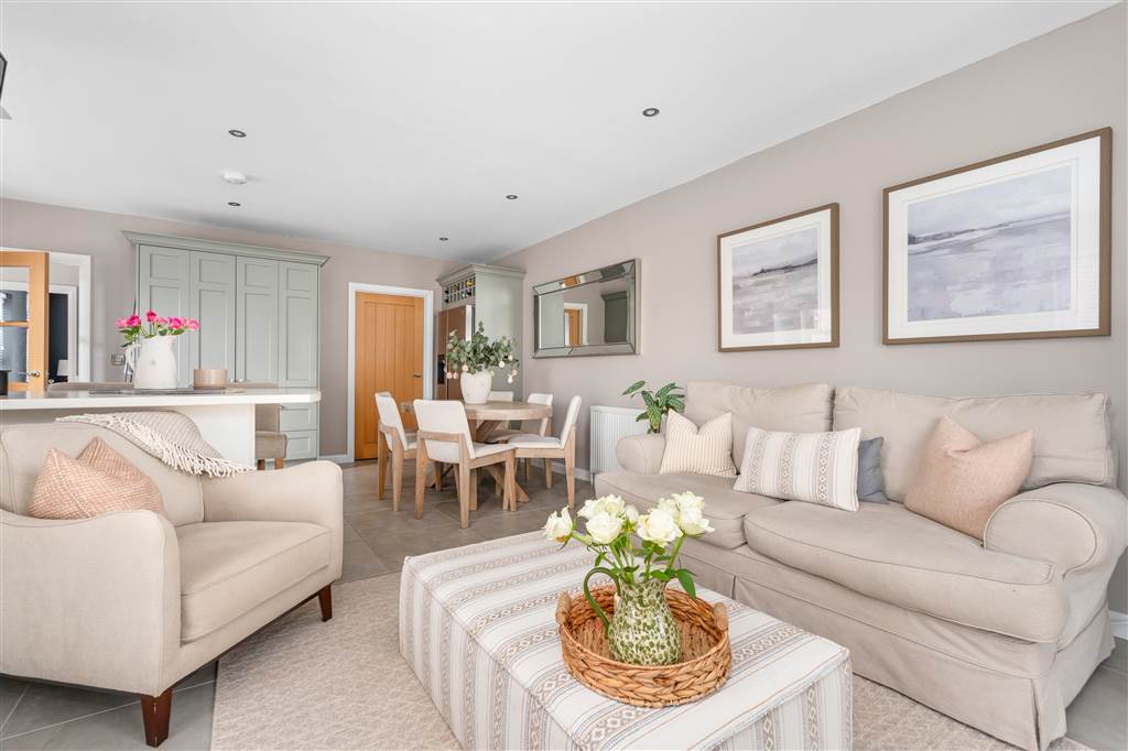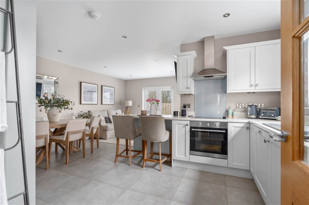 With a range of eye and low-level fitted units, 1 1/4 bowl sink unit and drainer with stainless-steel mixer tap. Integrated four ring electric hob and oven with stainless-steel extractor fan over. Integrated dishwasher. Space for American style fridge-freezer. Cutlery drawers. Saucepan drawers. Storage cabinet with bi-folding doors. Breakfast bar with seating area. Spacious area for dining. Living area with gas stove. Spot lighting to ceiling. Tiled flooring. PVC double glazed doors to rear.