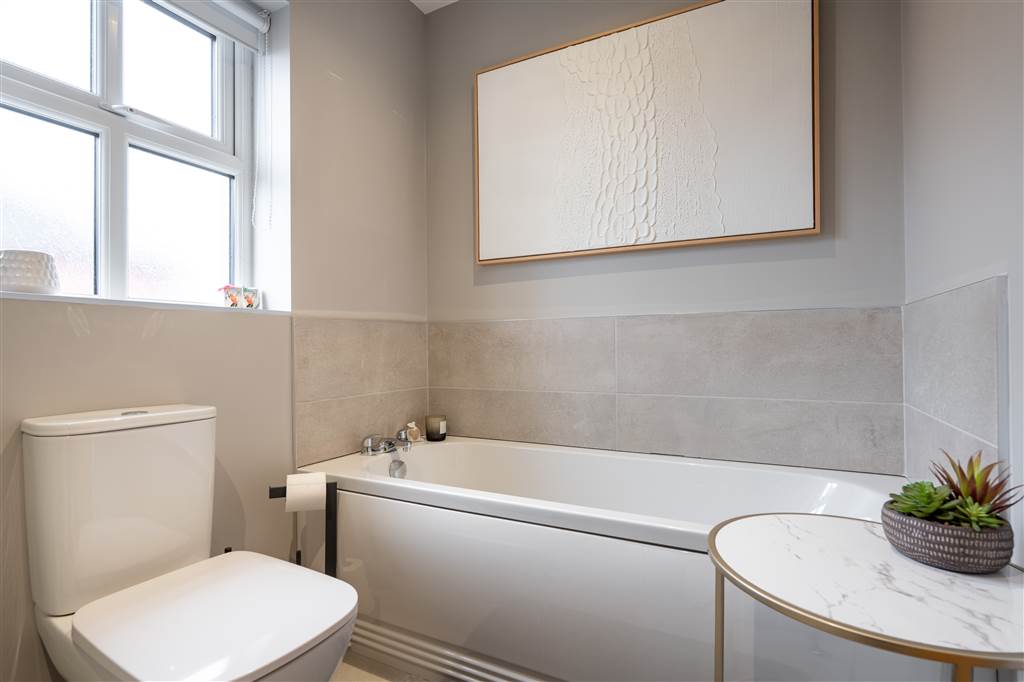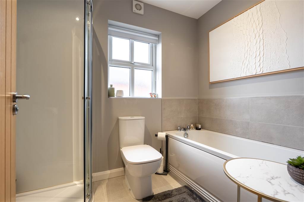 With 4-piece white suite comprising LFWC, WHB with built-in vanity unit, panelled bath and shower to enclosed corner cubicle. Heated towel rail. Spot lighting to ceiling. Splash back tiling. Tiled flooring.