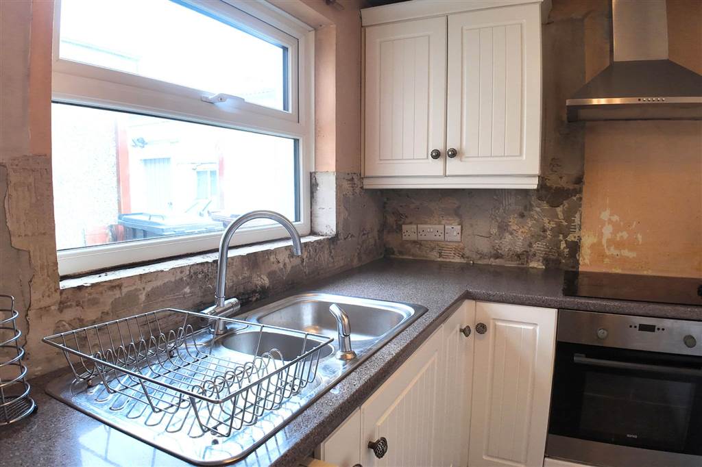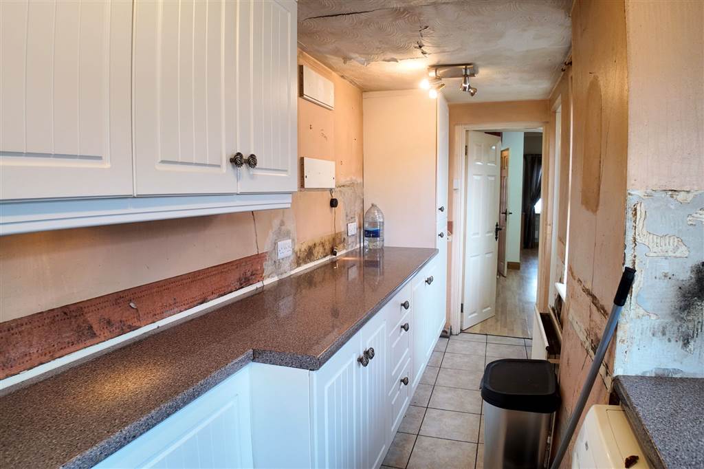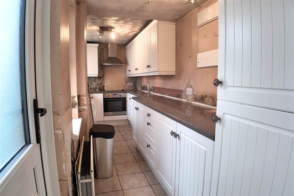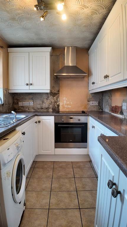 With a range of eye and low-level fitted units, 1 1/4 bowl stainless-steel sink unit and drainer with stainless-steel mixer tap. Integrated four ring electric hob and oven with extractor fan over. Integrated fridge/freezer. Plumbed for washing machine. Cutlery drawer. Saucepan drawers. Tiled flooring. PVC door to rear.