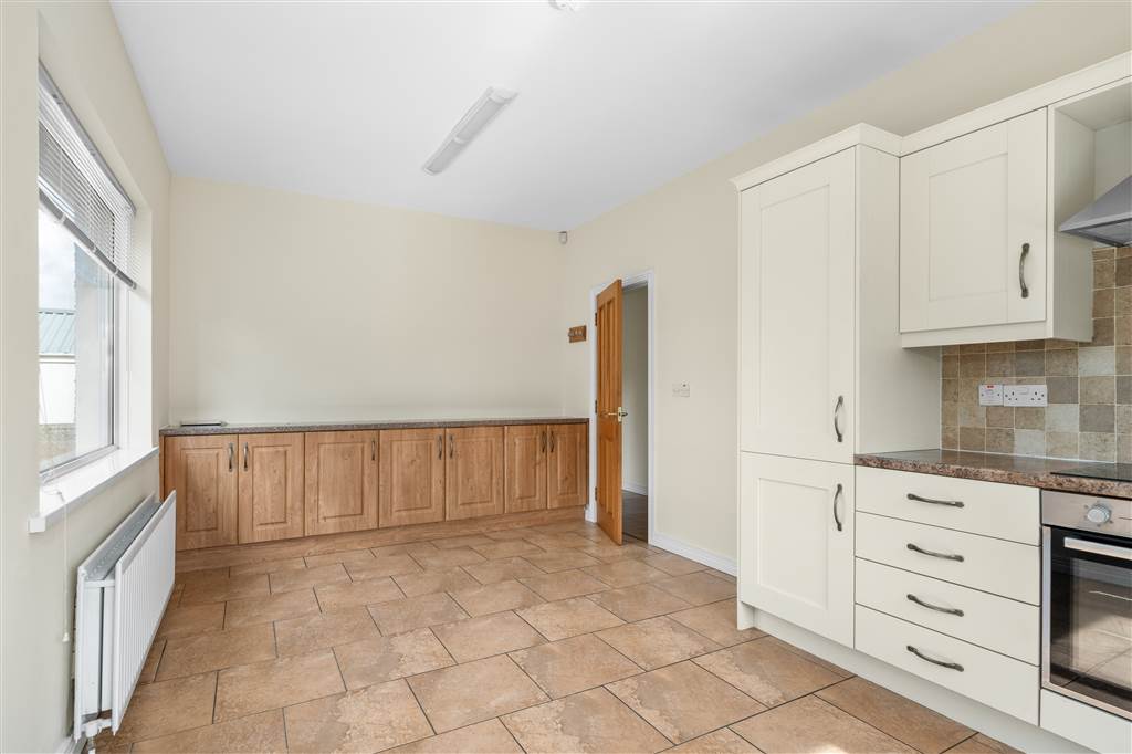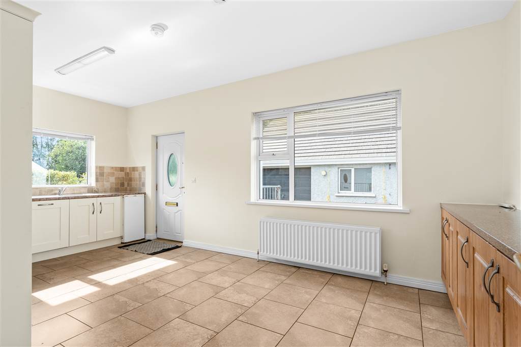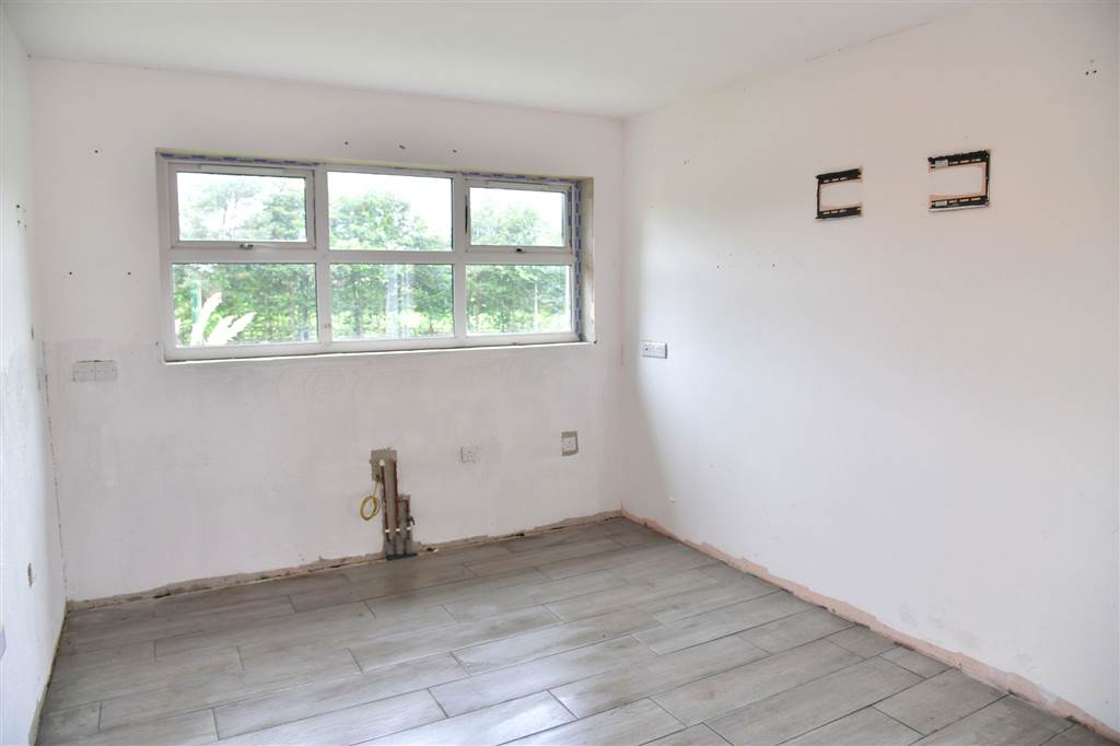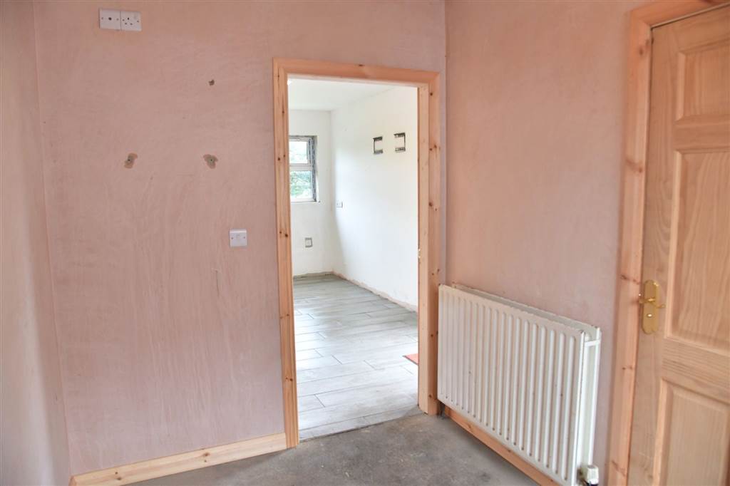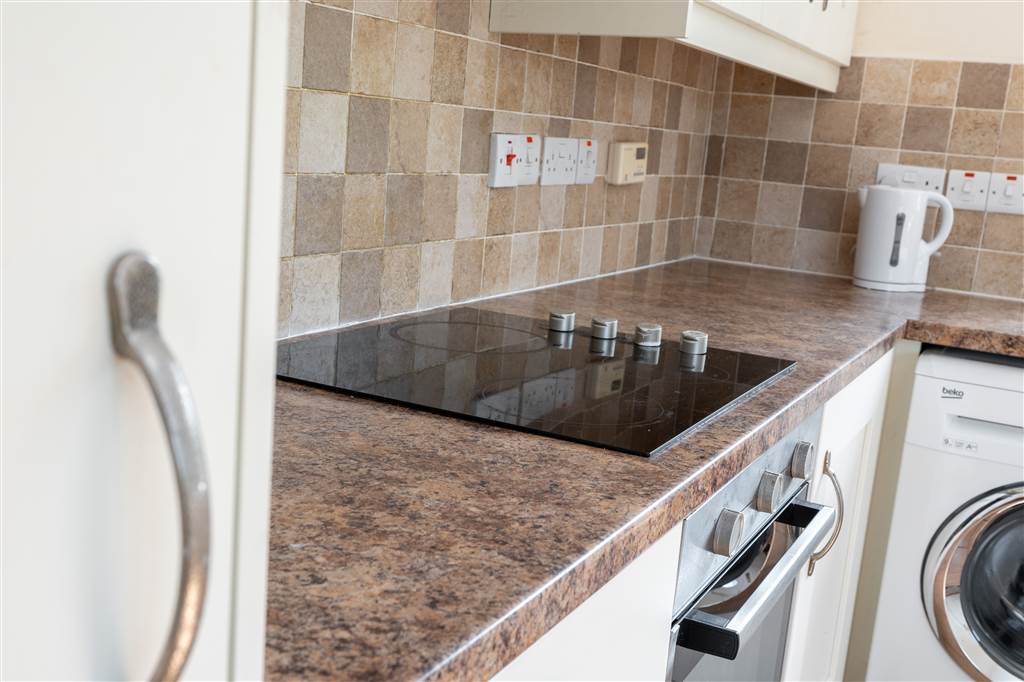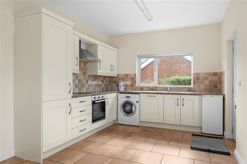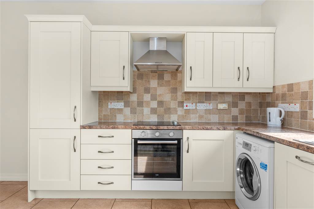 With a range of eye and low-level fitted units, stainless-steel sink unit and drainer with stainless-steel mixer tap. Integrated electric hob and oven with stainless-steel extractor fan over. Integrated dishwasher. Plumbed for washing machine. Space for under counter fridge-freezer. Cutlery drawers. Additional low-level fitted units and bottom of kitchen for storage. Splash back tiling. Tiled flooring. Composite door to rear.