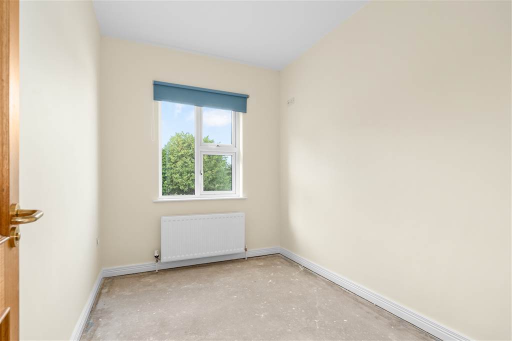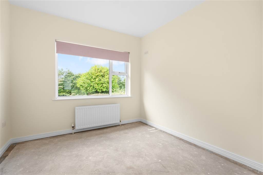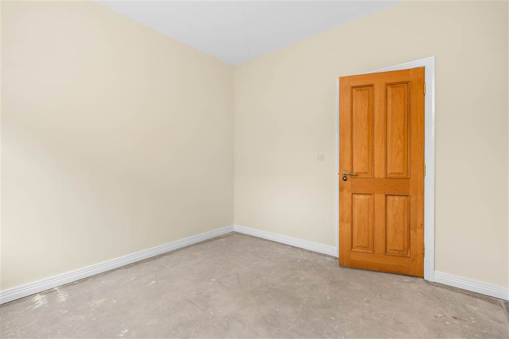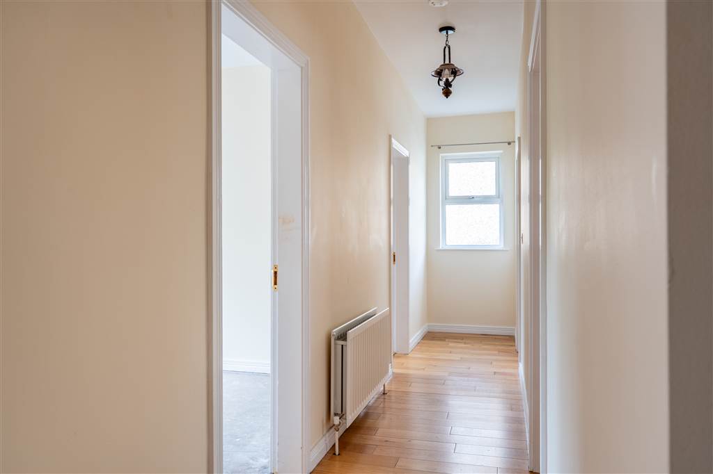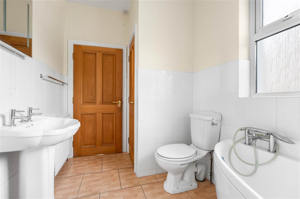 With 4-piece white suite comprising LFWC, WHB, corner bath with hand-held shower head and shower to enclosed corner cubicle. Hot-press with shelved storage. Part tiled walls. Tiled flooring.