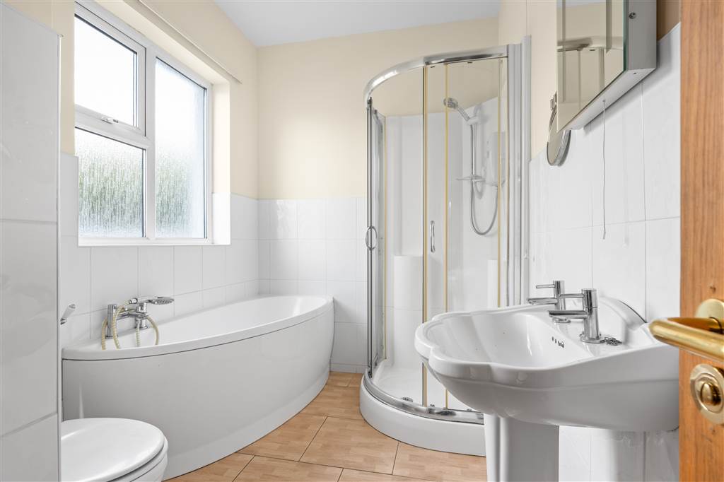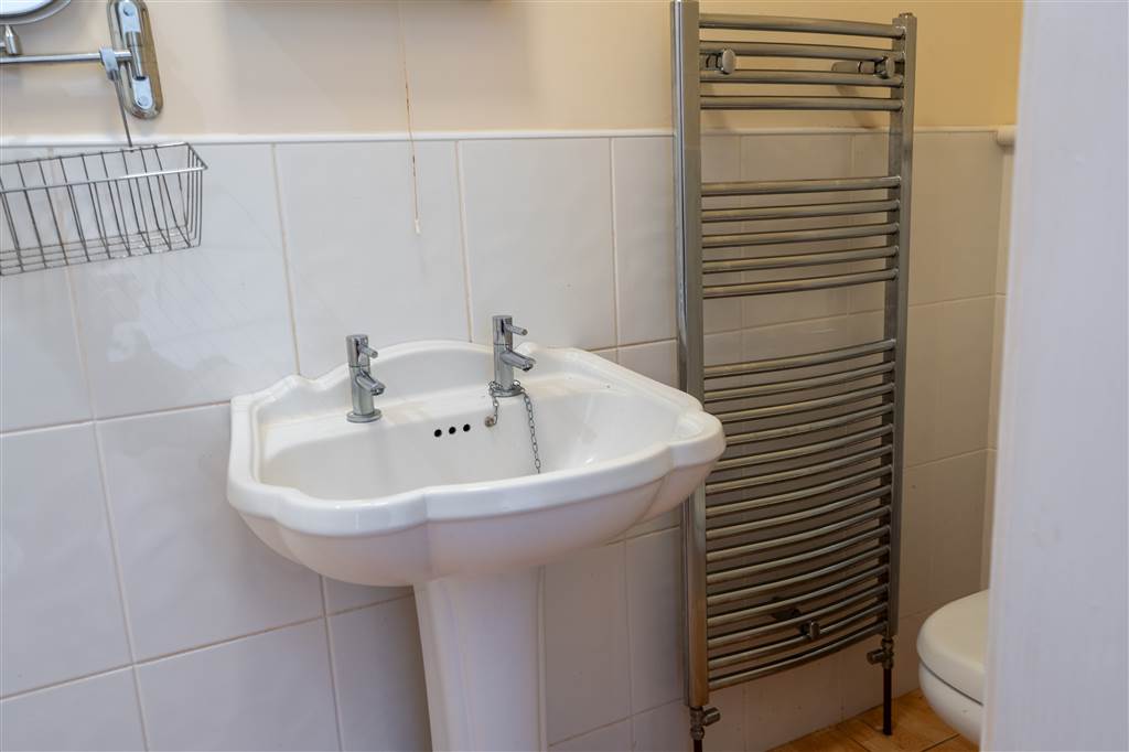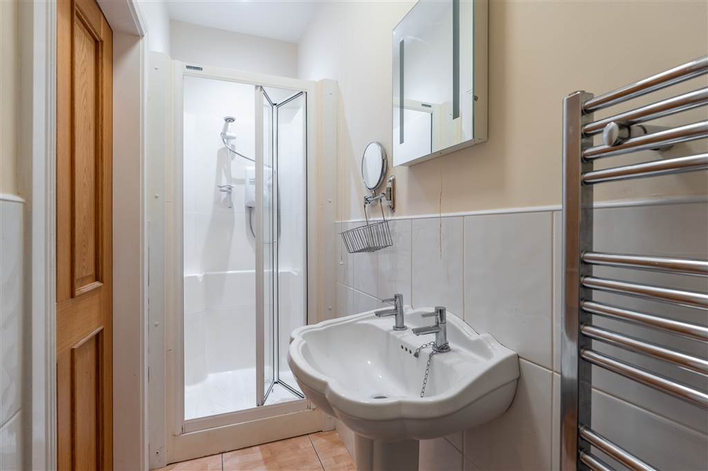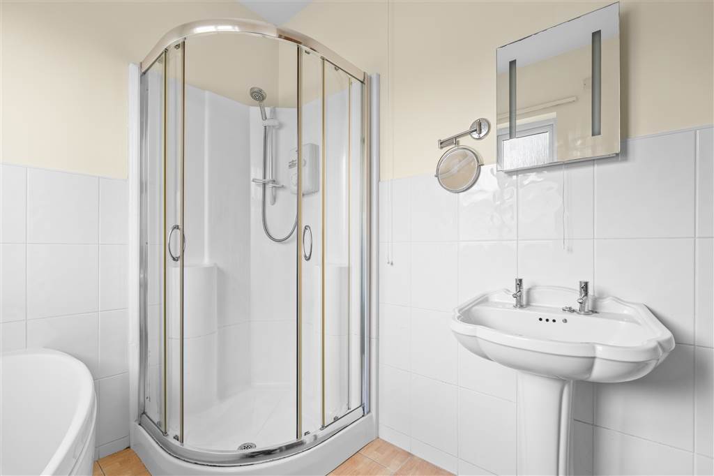 With 3-piece white suite comprising LFWC, WHB and shower to enclosed cubicle. Heated towel rail. Part tiled walls. Tiled flooring.