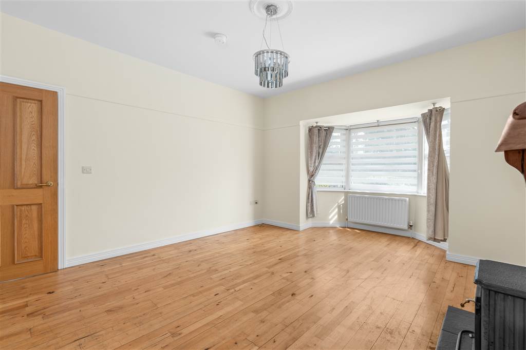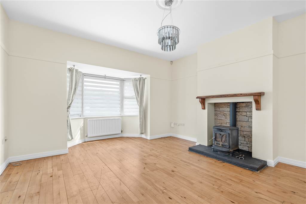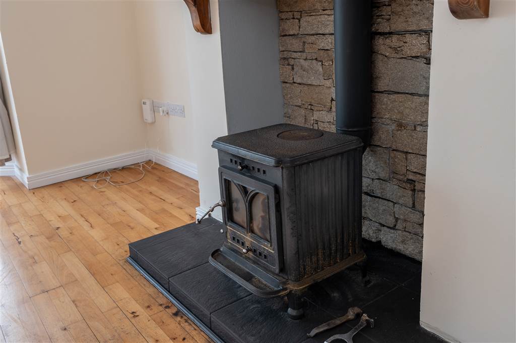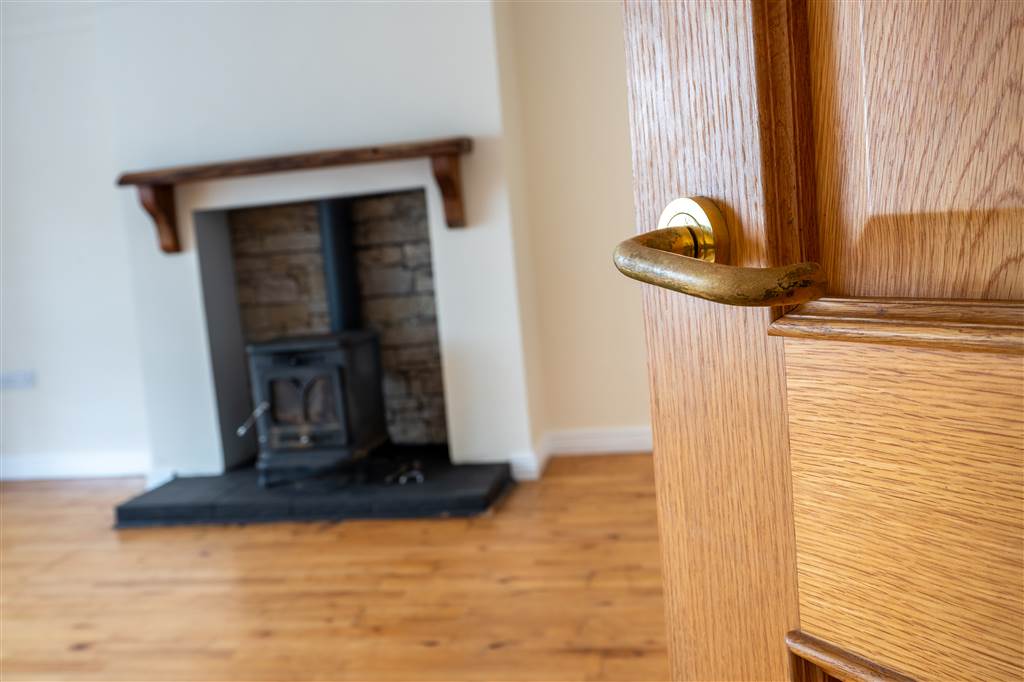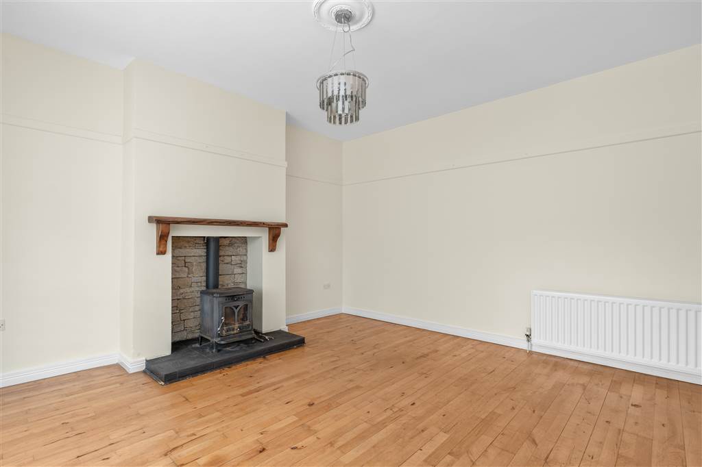 With multi-fuel burning stove to tiled hearth, stone cladding and wooden mantle. Bay window. Picture rail. Solid wooden flooring.