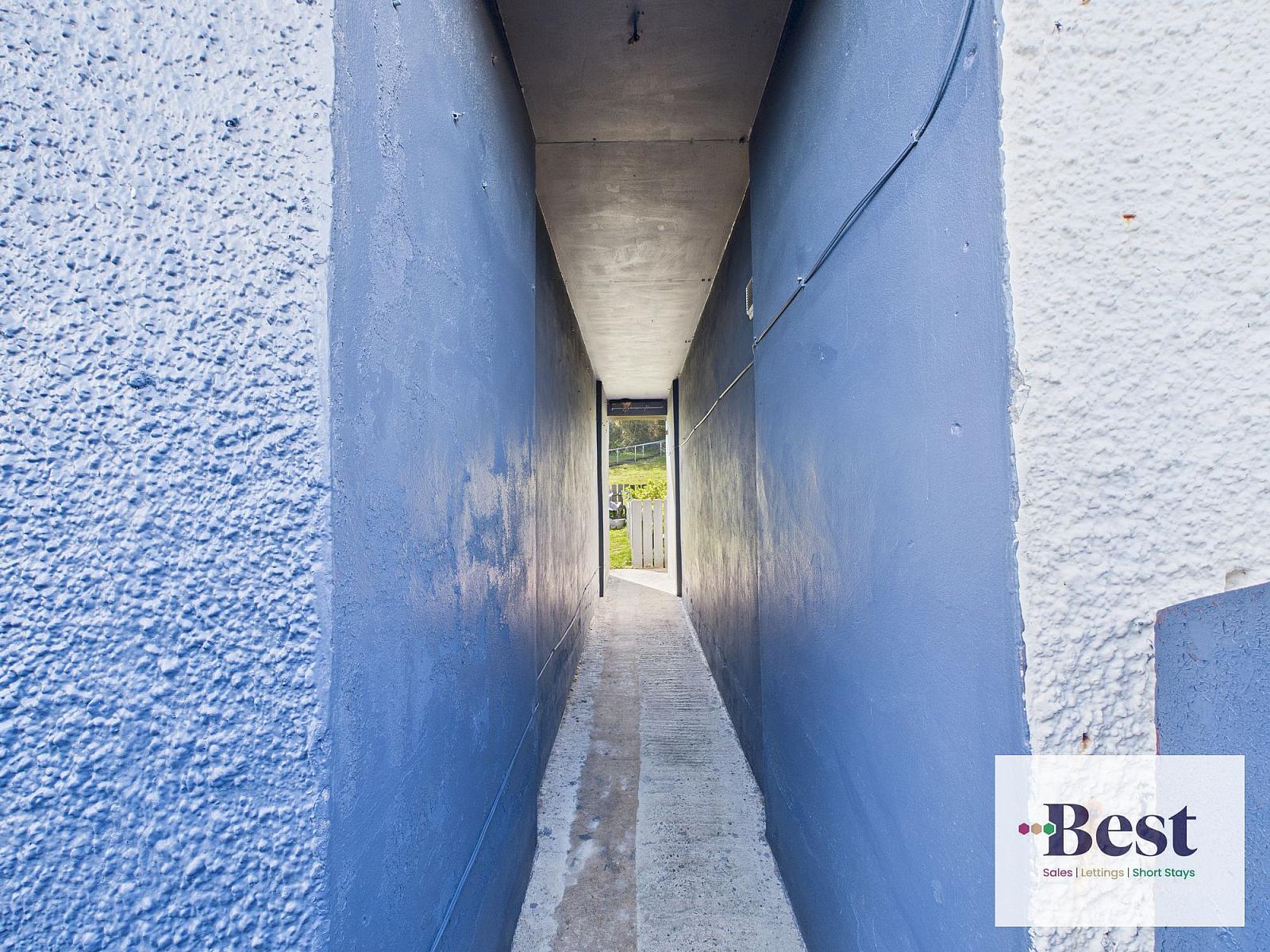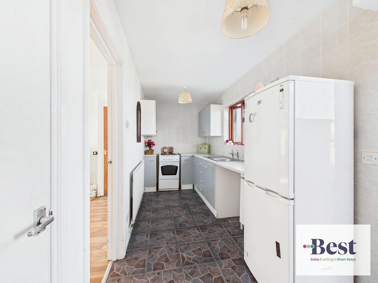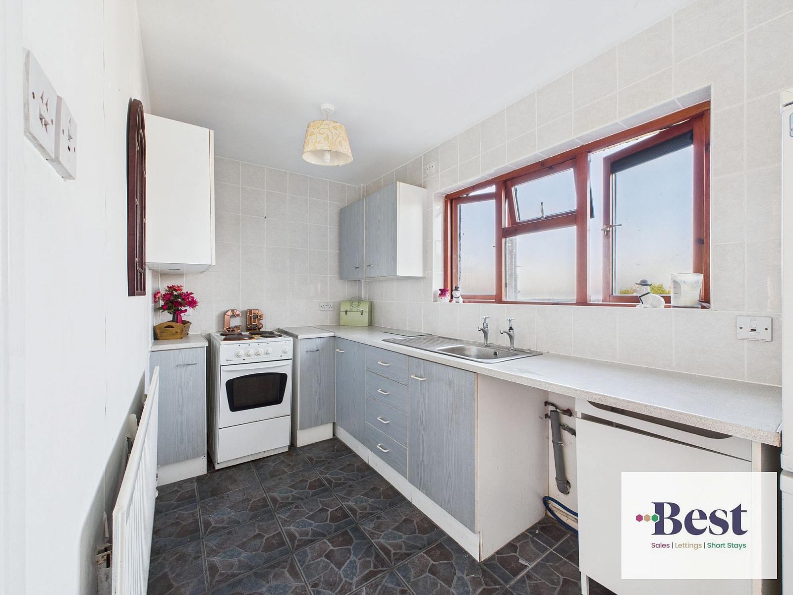 Exceptional Sea views. Range of high and low level units, space for appliances tiled flooring. Door to rear garden. Under stairs storage