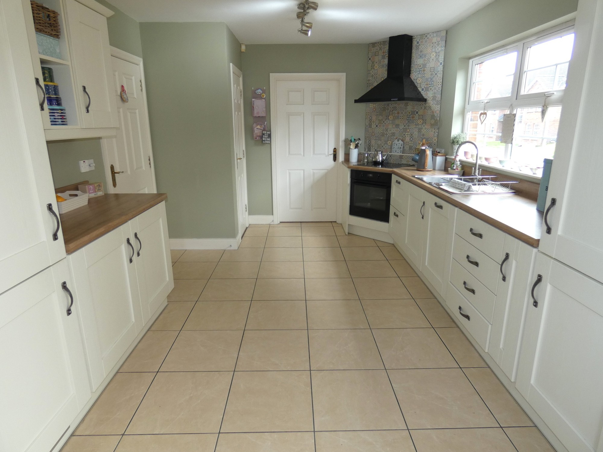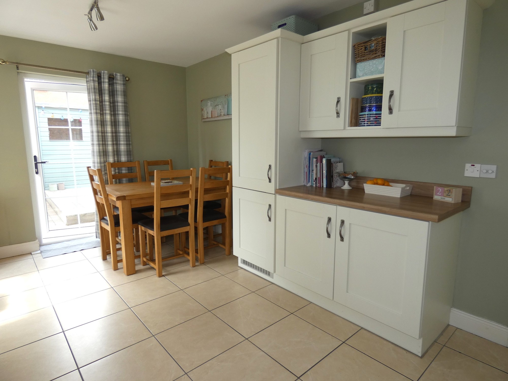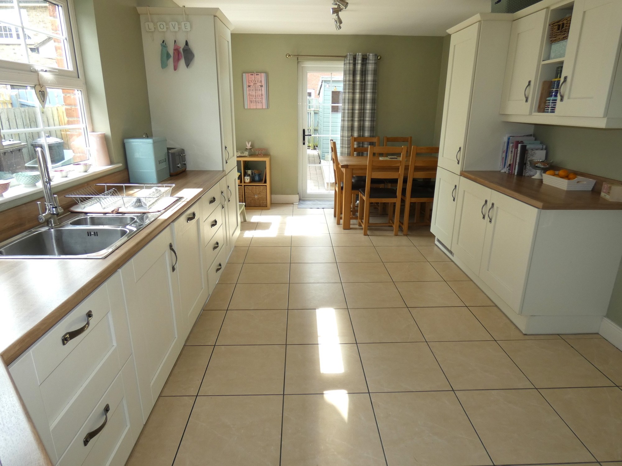 Recently fitted new kitchen comprising an extensive range of eye and low level units, bowl and a half stainless steel sink with a mixer tap, wood effect worktop with a matching splashback, integrated fan oven, ceramic hob, feature splashback and an extractor fan over, integrated dishwasher, integrated fridge freezer, pan drawers, shelved larder unit with a light, additional shelved larder unit including pull out vegetable baskets, display shelves, attractive tiled floor, seating area and a fully glazed door to the landscaped rear garden.