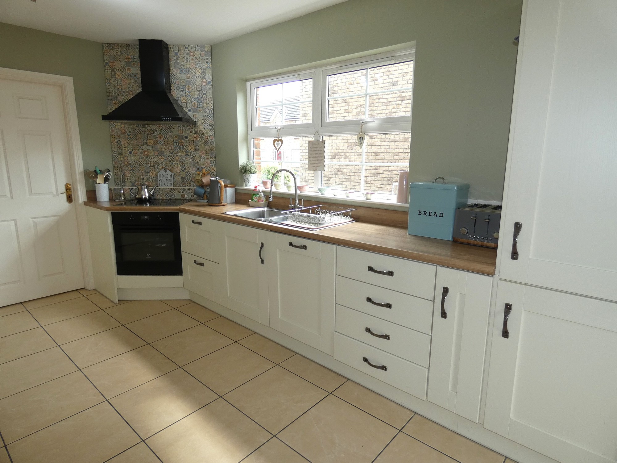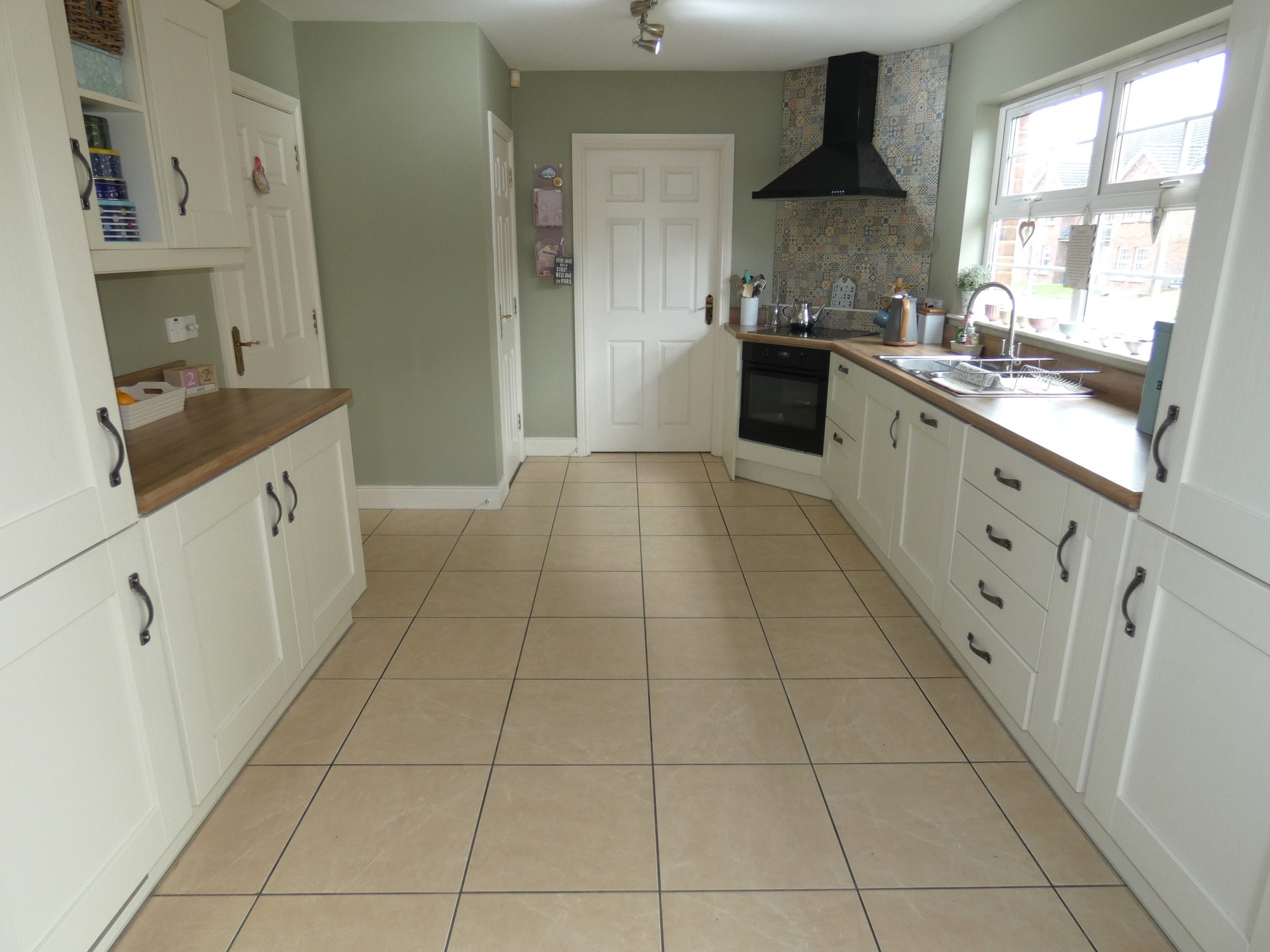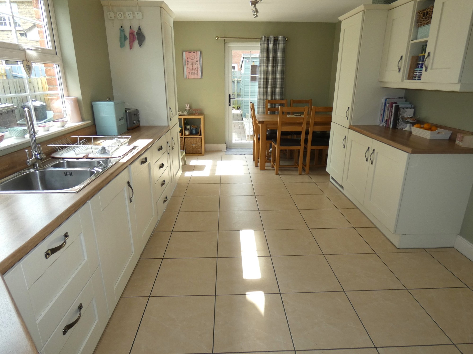 Recently fitted new kitchen comprising an extensive range of eye and low level units, bowl and a half stainless steel sink with a mixer tap, wood effect worktop with a matching splashback, integrated fan oven, ceramic hob, feature splashback and an extractor fan over, integrated dishwasher, integrated fridge freezer, pan drawers, shelved larder unit with a light, additional shelved larder unit including pull out vegetable baskets, display shelves, attractive tiled floor, seating area and a fully glazed door to the landscaped rear garden.