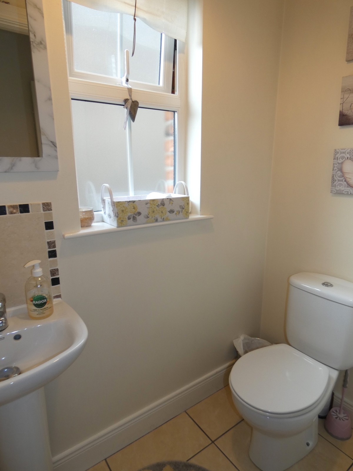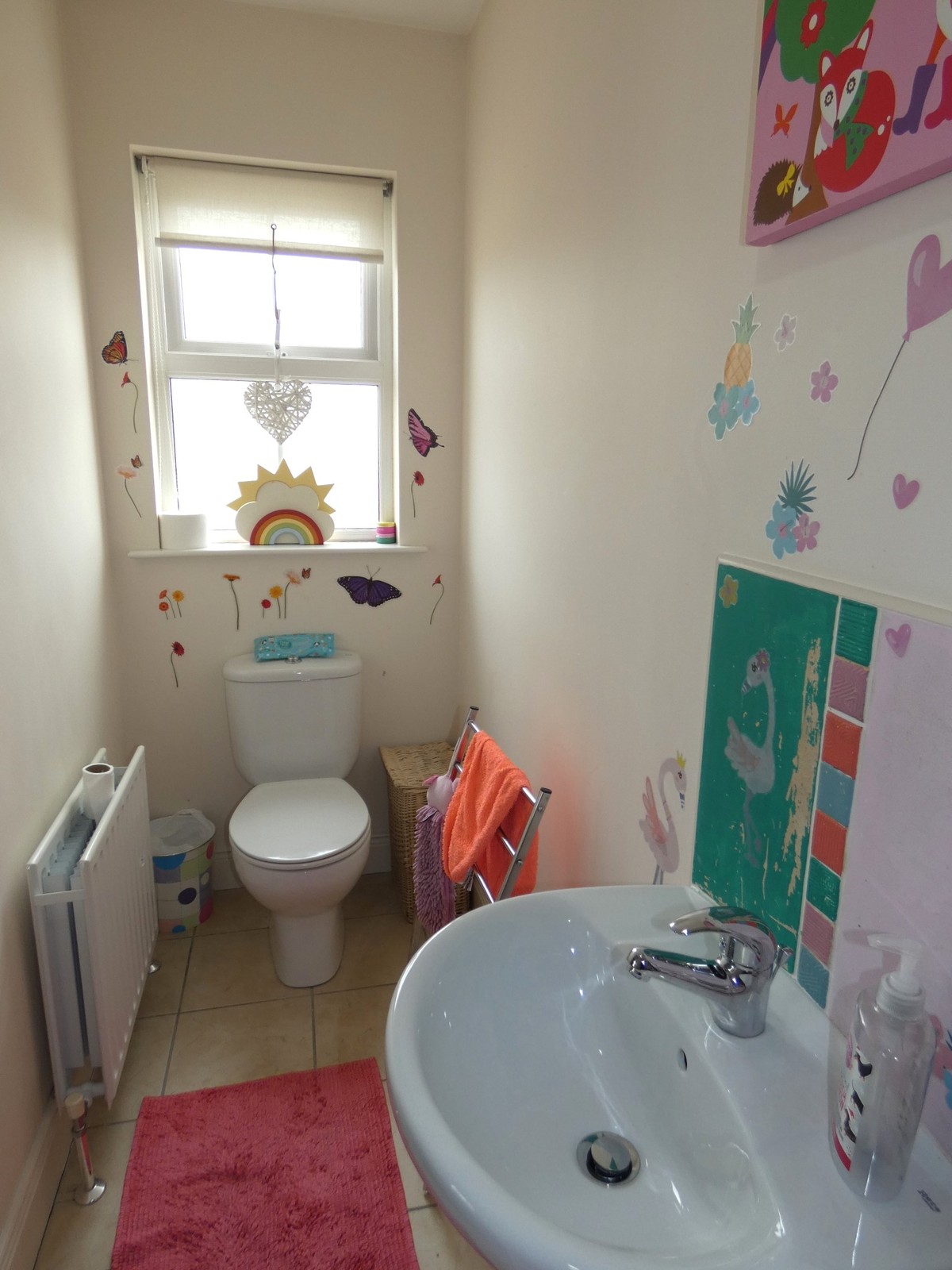 With w.c, wash hand basin, tiled splashback and tiled floor.