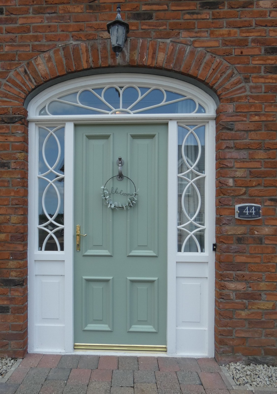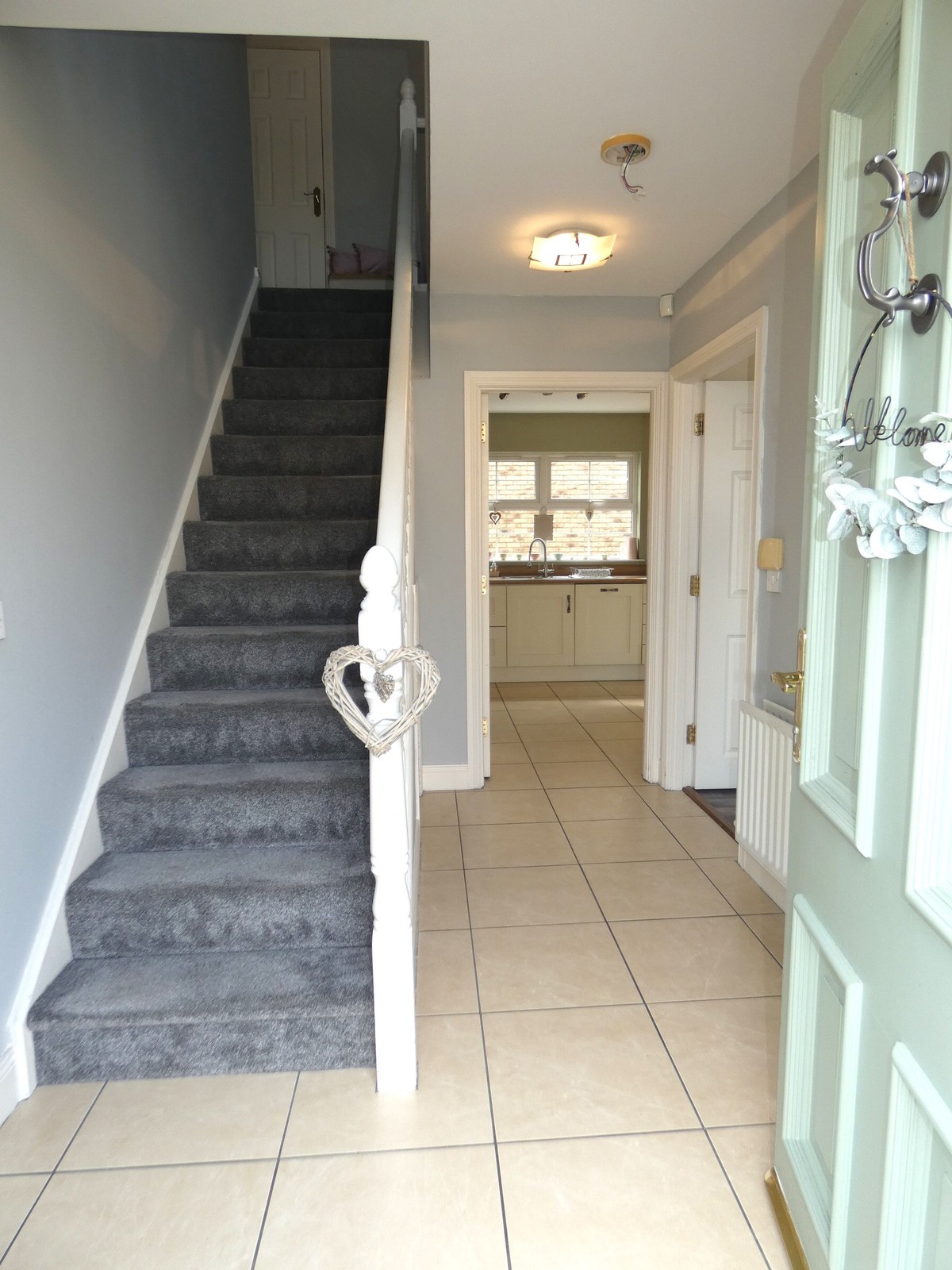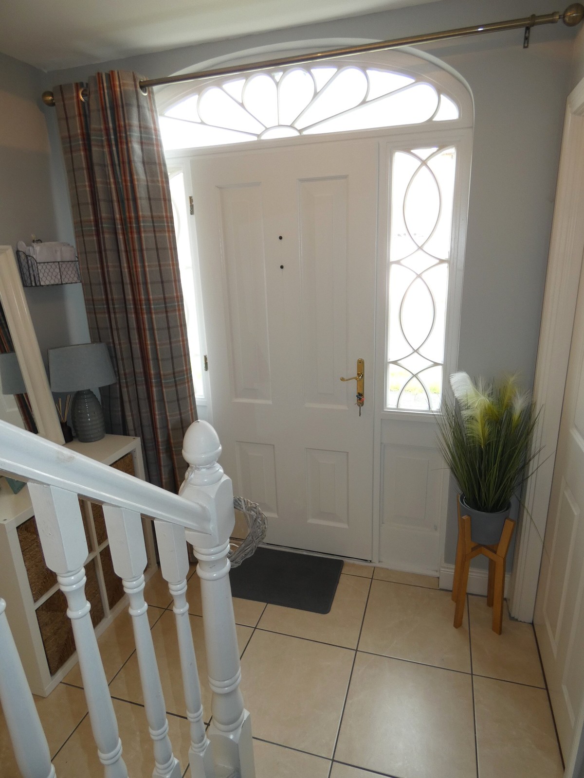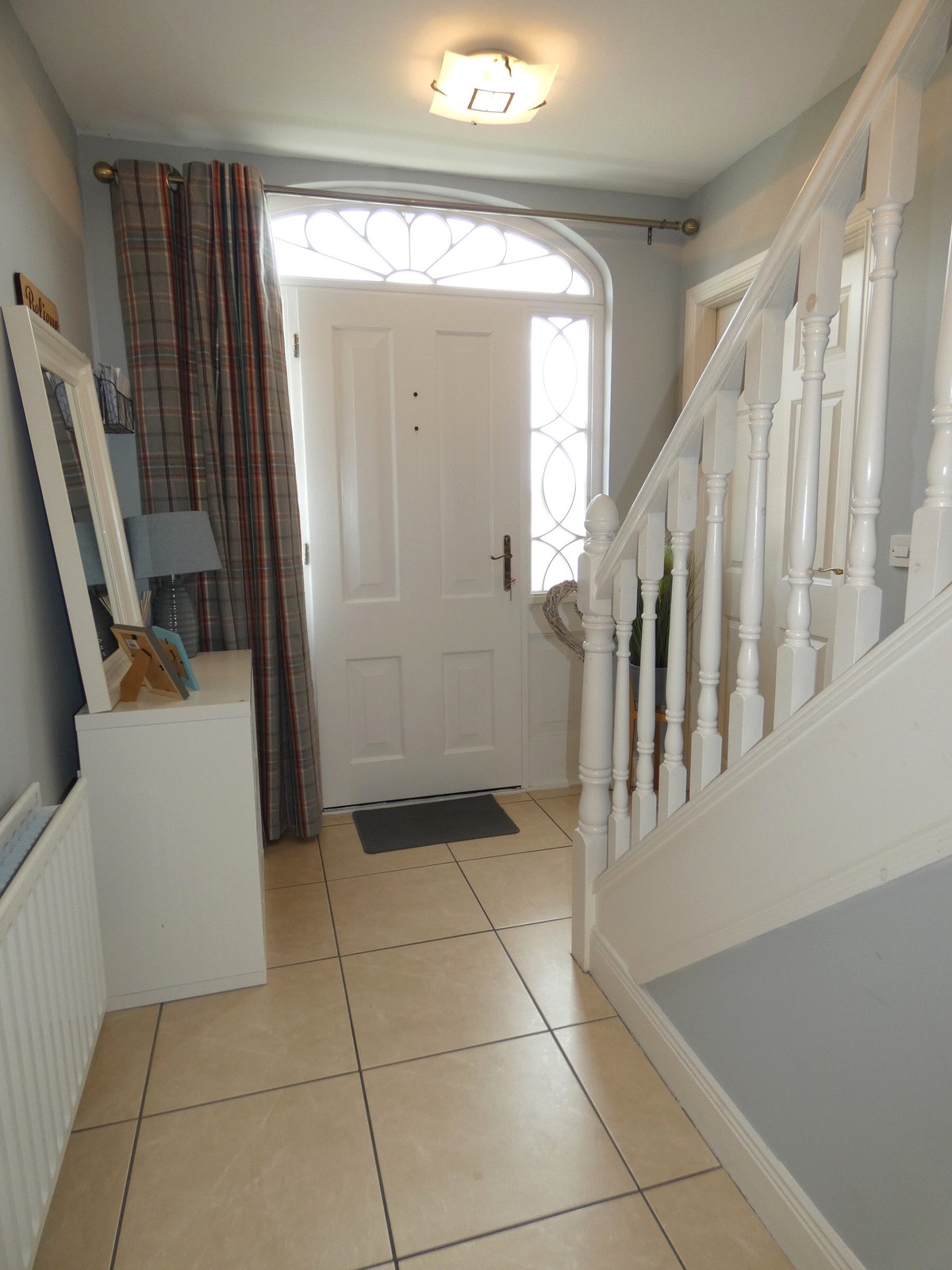 Attractive Georgian style front door with partly glazed side panels and a fan over, tiled floor, telephone point and a useful storage cupboard under the stairs.