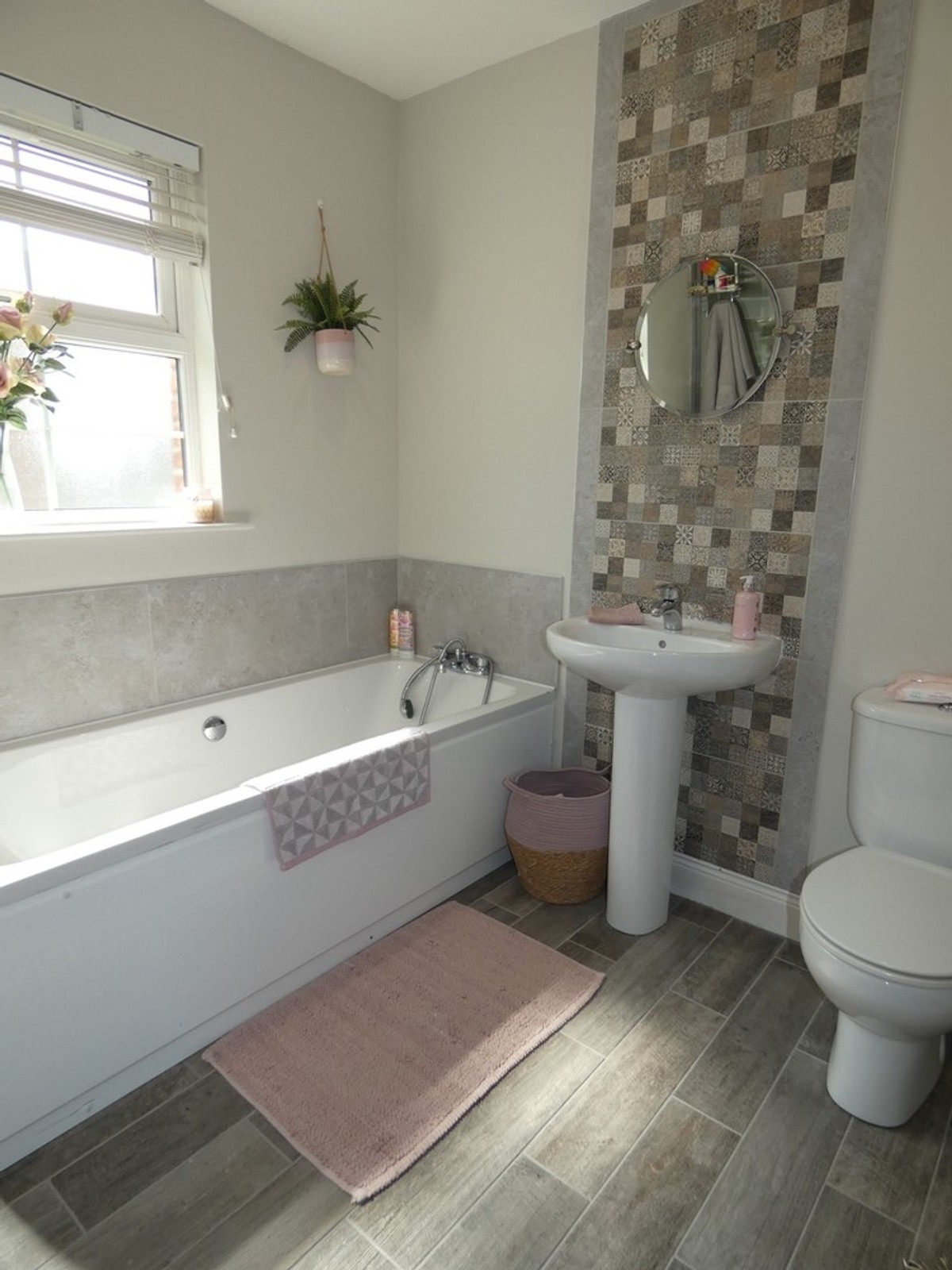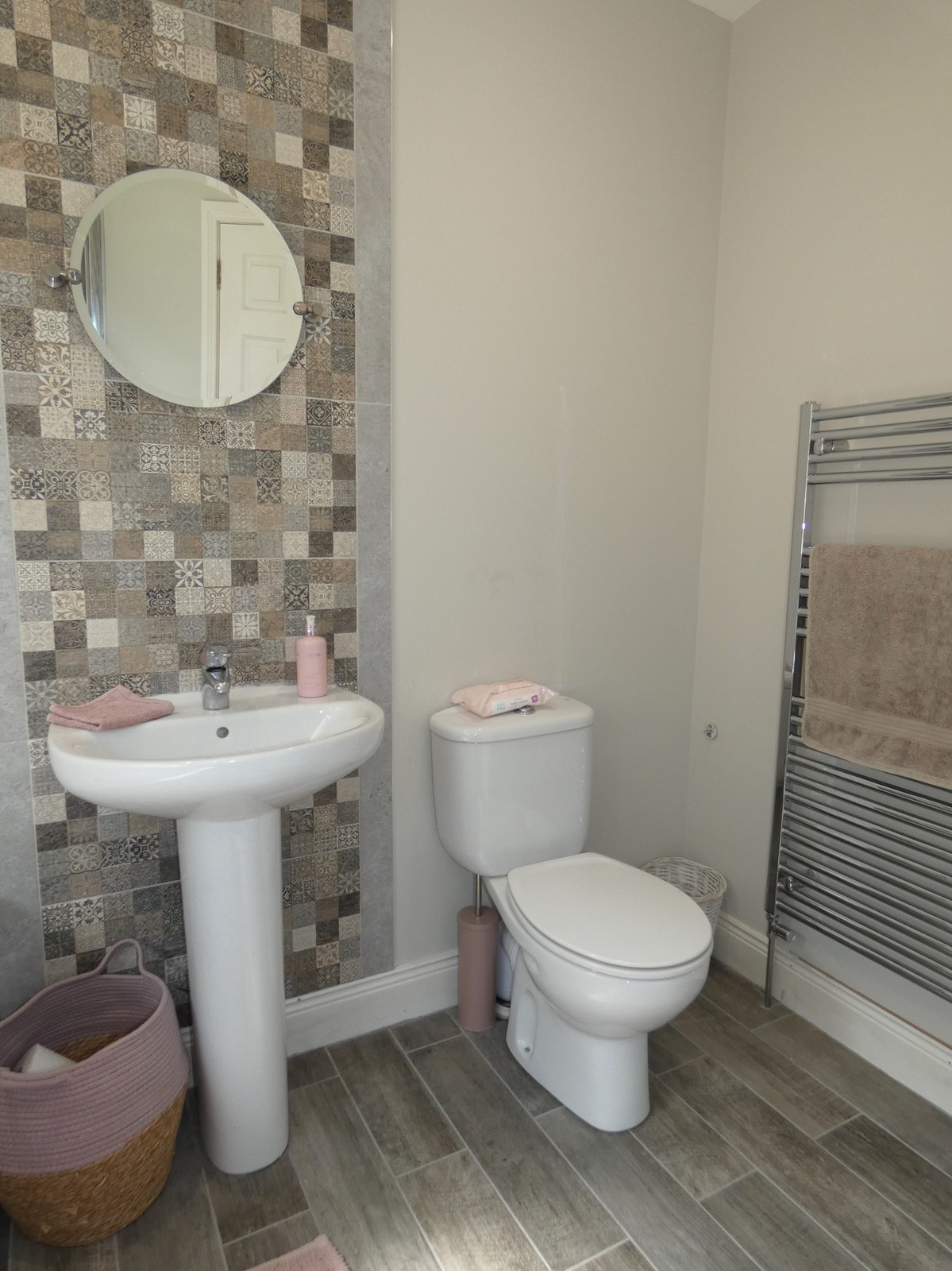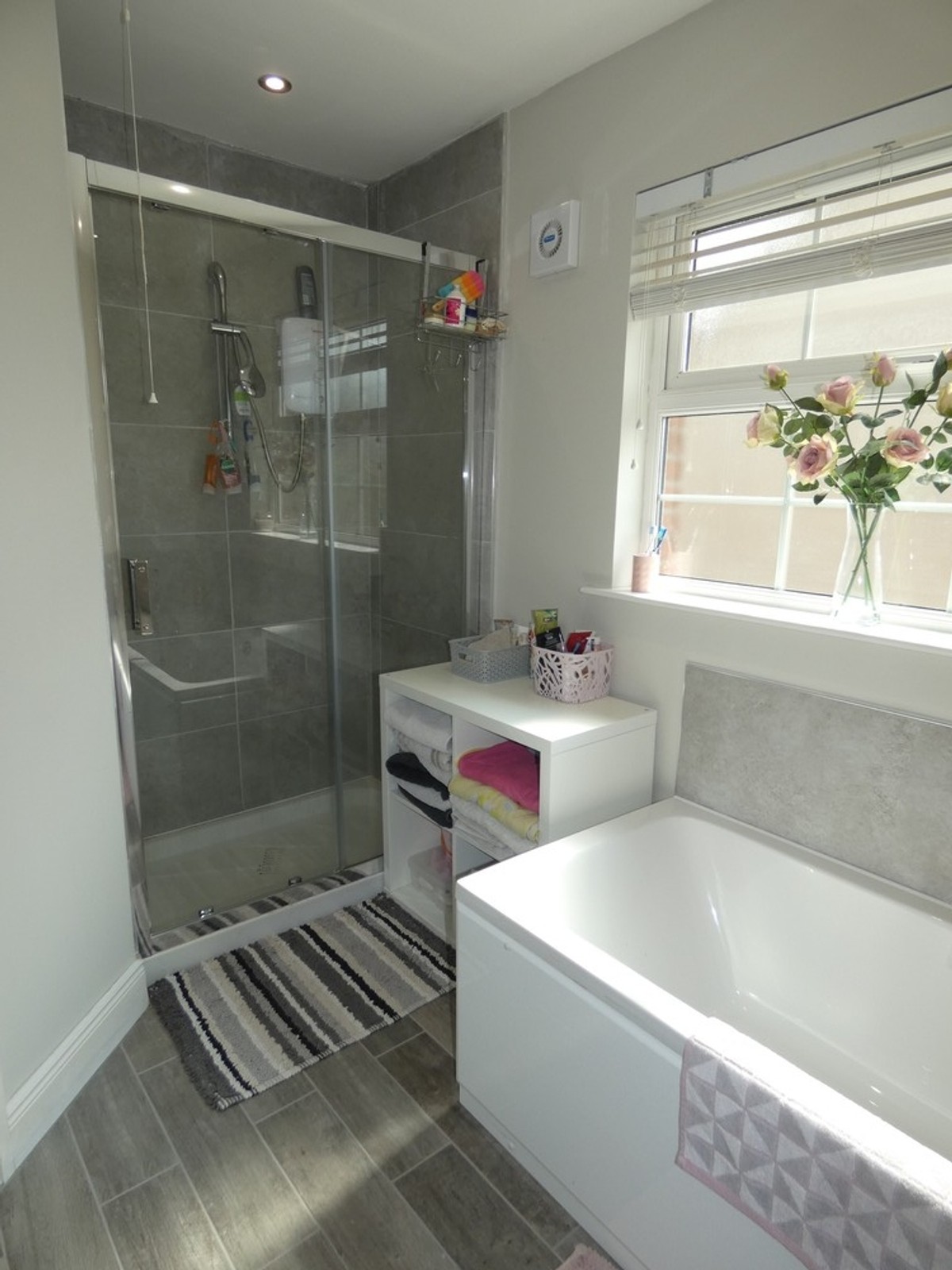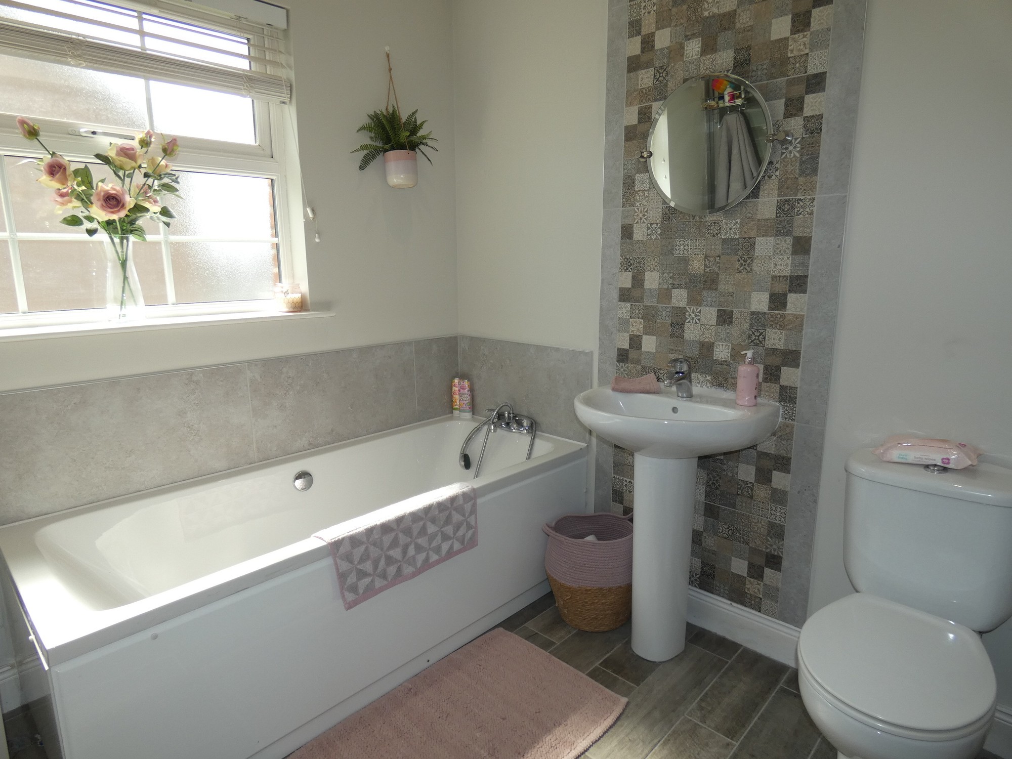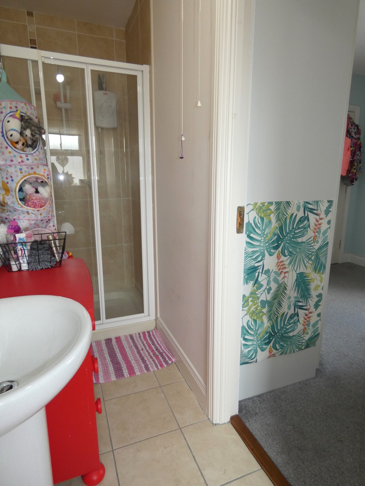 Fitted suite including a panel bath with a telephone hand shower attachment and tiled splashback, w.c, pedestal wash hand basin with a feature floor to ceiling splashback, heated chrome towel rail, tiled floor, recessed ceiling spotlights, extractor fan and a large tiled double shower cubicle with a Redring electric shower.