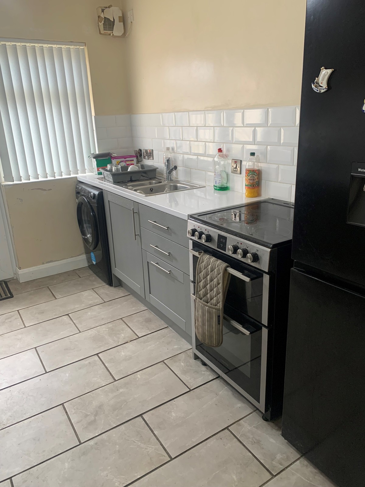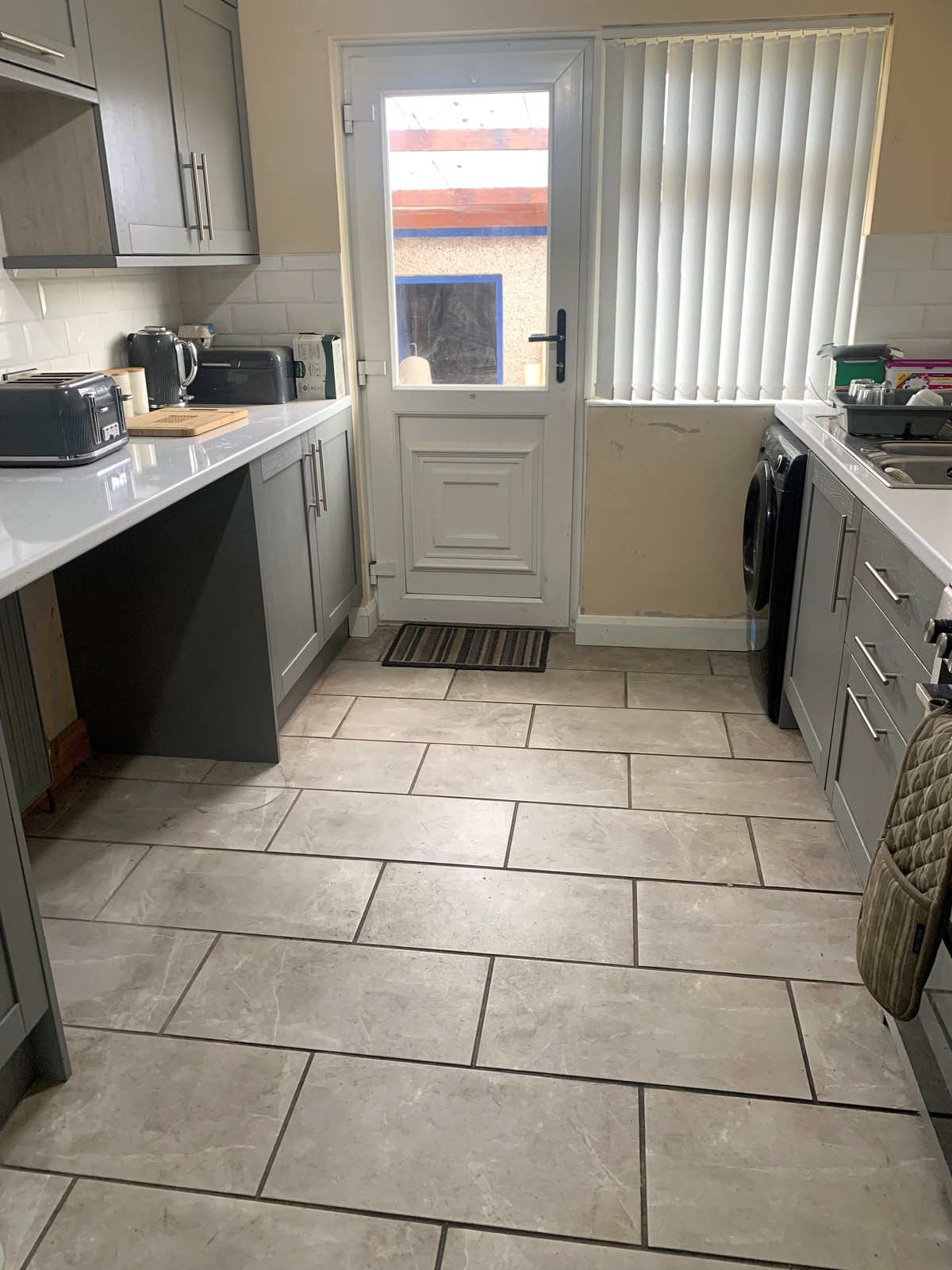 Only recently fitted and comprising a range of painted finish eye and low level units, contemporary tiled splashback, bowl and a half stainless steel sink, space for a cooker and an upright fridge freezer, plumbed for an automatic washing machine, fitted pull out bin, overhead storage, tiled floor and a partly glazed uPVC door to the rear.
